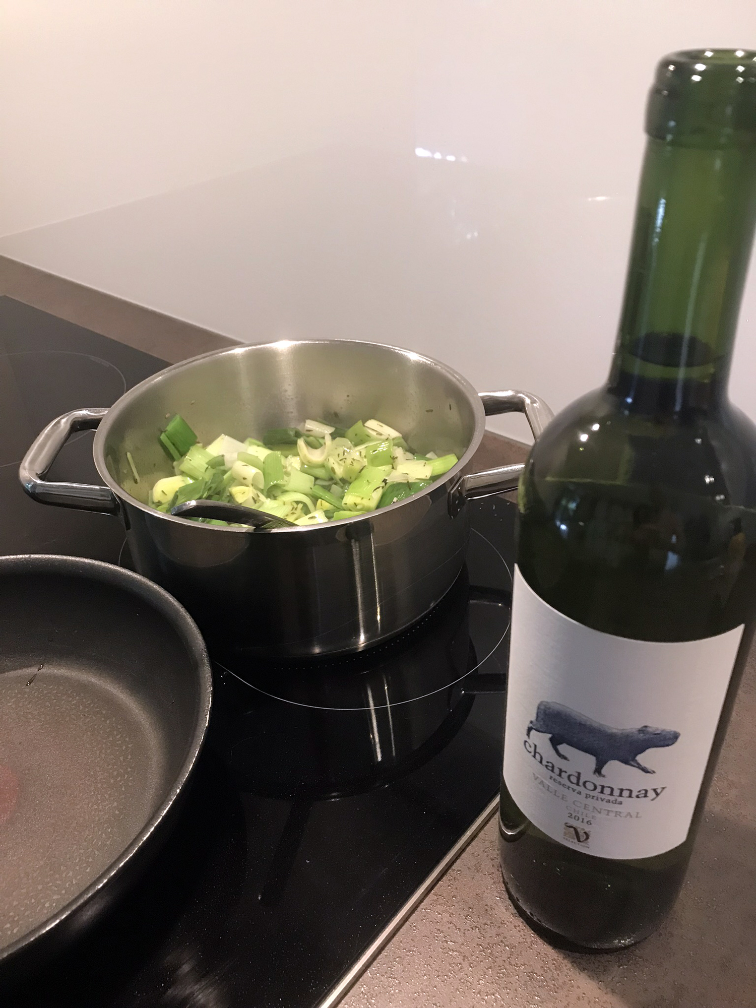 Wat heb je nodig? Drie of vier stronken prei, twee teentjes knoflook, een halve liter groentebouillon, tijm, een glas witte wijn en geduld!