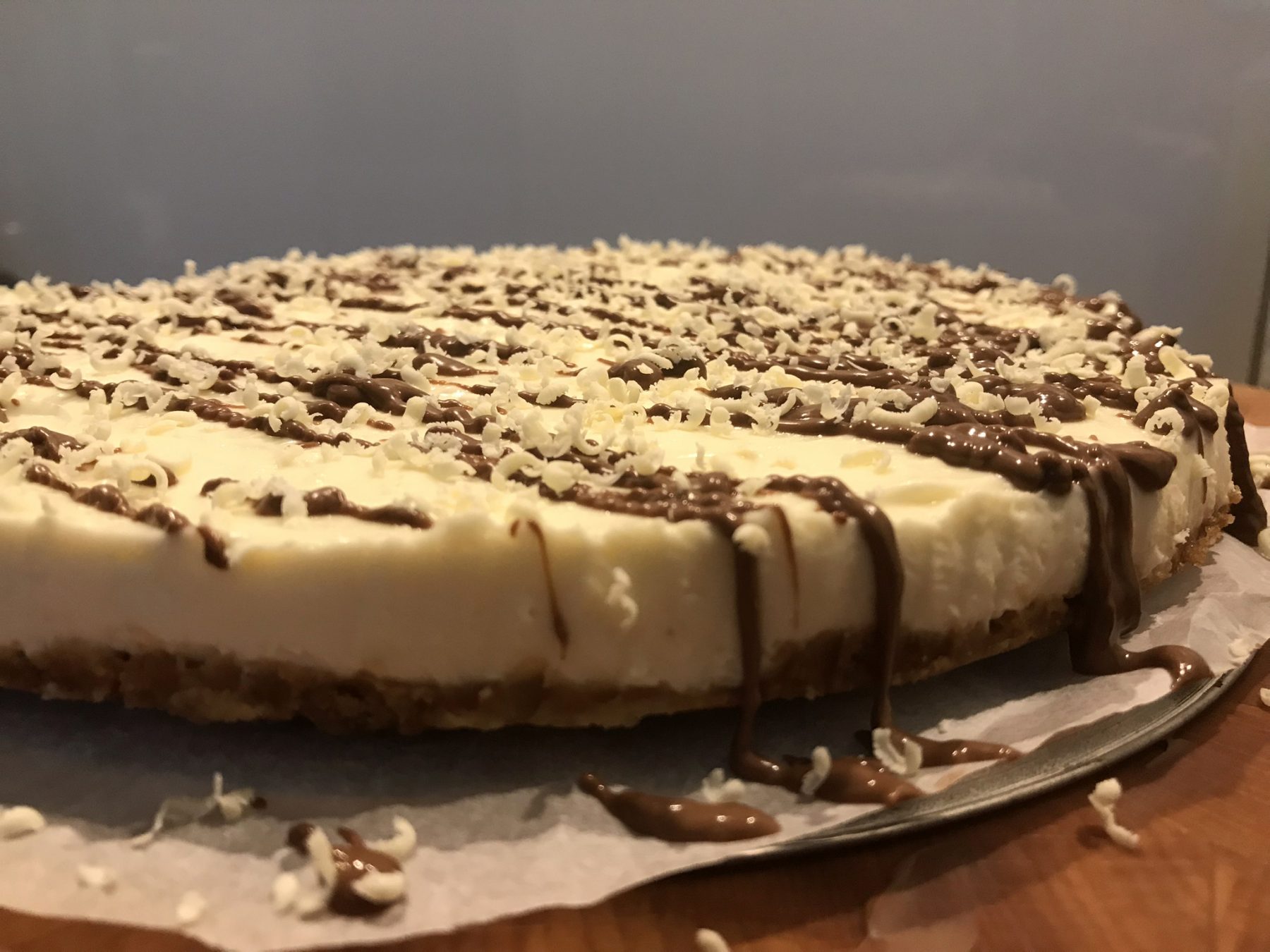 Nu kun je verder met de topping. Smelt als eerste de witte chocola au-bain-marie. Ofwel in een pannetje of kommetje dat net een ketel met warm water raakt. Makkie. Daarna klop je de slagroom lobbig. Je voegt hier geen suiker aan toe! Daarna neem je de roomkaas en de mascarpone en klopt deze door elkaar. Vervolgens meng je de slagroom erdoor tot het een mooi geheel is. En daarna volgt de gesmolten witte chocola. Proef maar eens van het beslag als je het mooi tot een glad mengsel hebt geroerd. Je neemt de springvorm met bodem uit de koelkast en verdeelt het mengsel erover. Daarna gaat het terug de koelkast in voor uren (uur of 8), zodat de cheesecake mooi hard wordt.