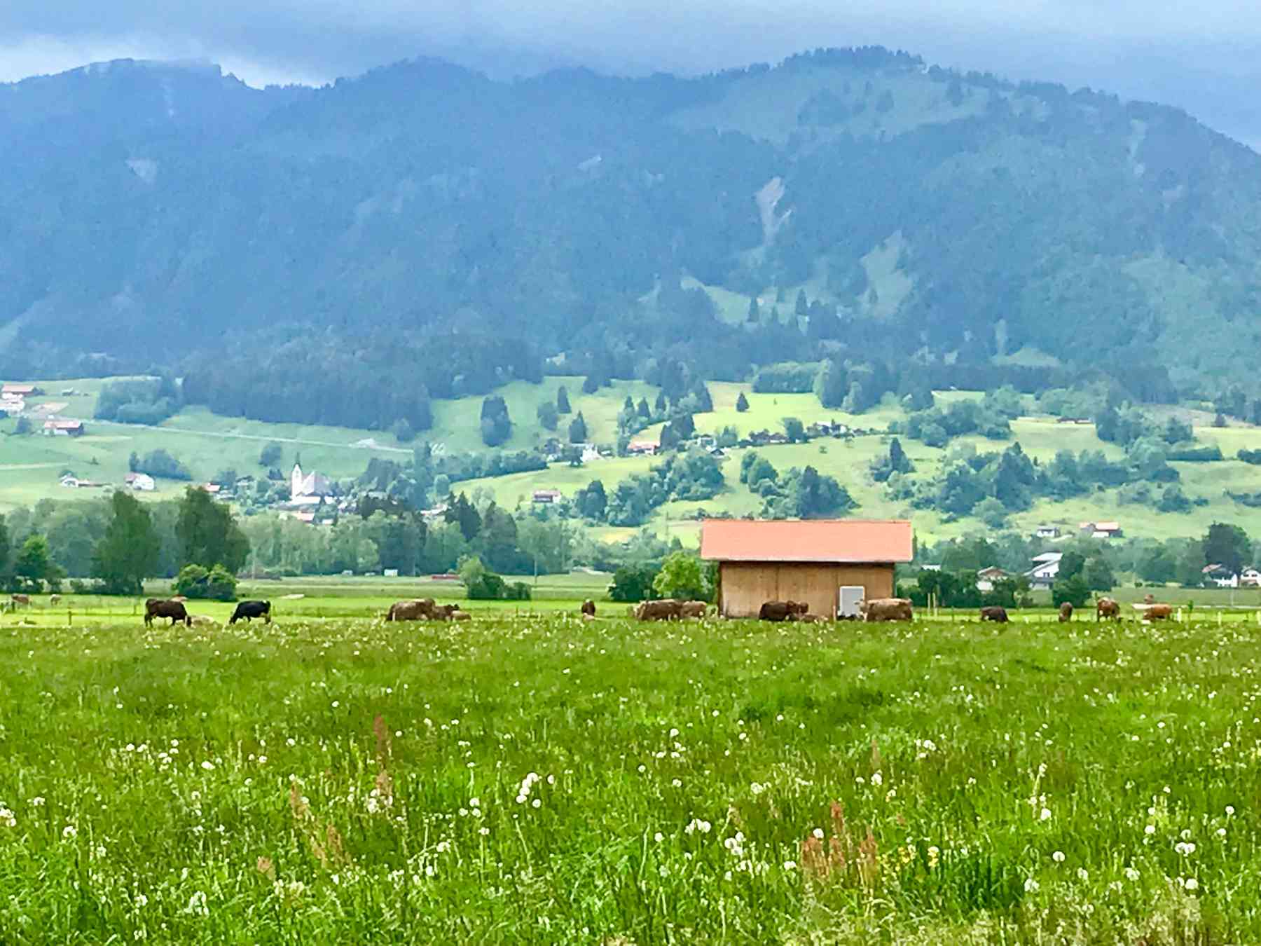 Als beloning eten we ons een lekkere hamburger bij de Mac en gaan daarna voldaan terug naar het hotel. Even opfrissen en naar het stadje terug waar we lekker door de zon wandelen en een goed hapje eten. Het leven is goed. En ik voel altijd dat ik leef als ik zo’n dingen doe. Als afsluiter maken we nog een goede wandeling langs de grazende koeien met alpenbellen om de nek. Als ik in die omgeving een koe zou zijn, zou ik na een paar uur al knettergek zijn van dat kabaal van die bel. Maar goed. Een lauw biertje maakt de dag af onder een overkapping als het hard regent. Cool. Na een super goed ontbijt plukken we op de terugweg de dag erna nog een super mooi veldboeket voor thuis. Aniek en Melle zijn blij als Rob weer heelhuids op de bank zit. Hebben we toch weer mooi gedaan, een leuke tijd en een mooie ervaring verder.