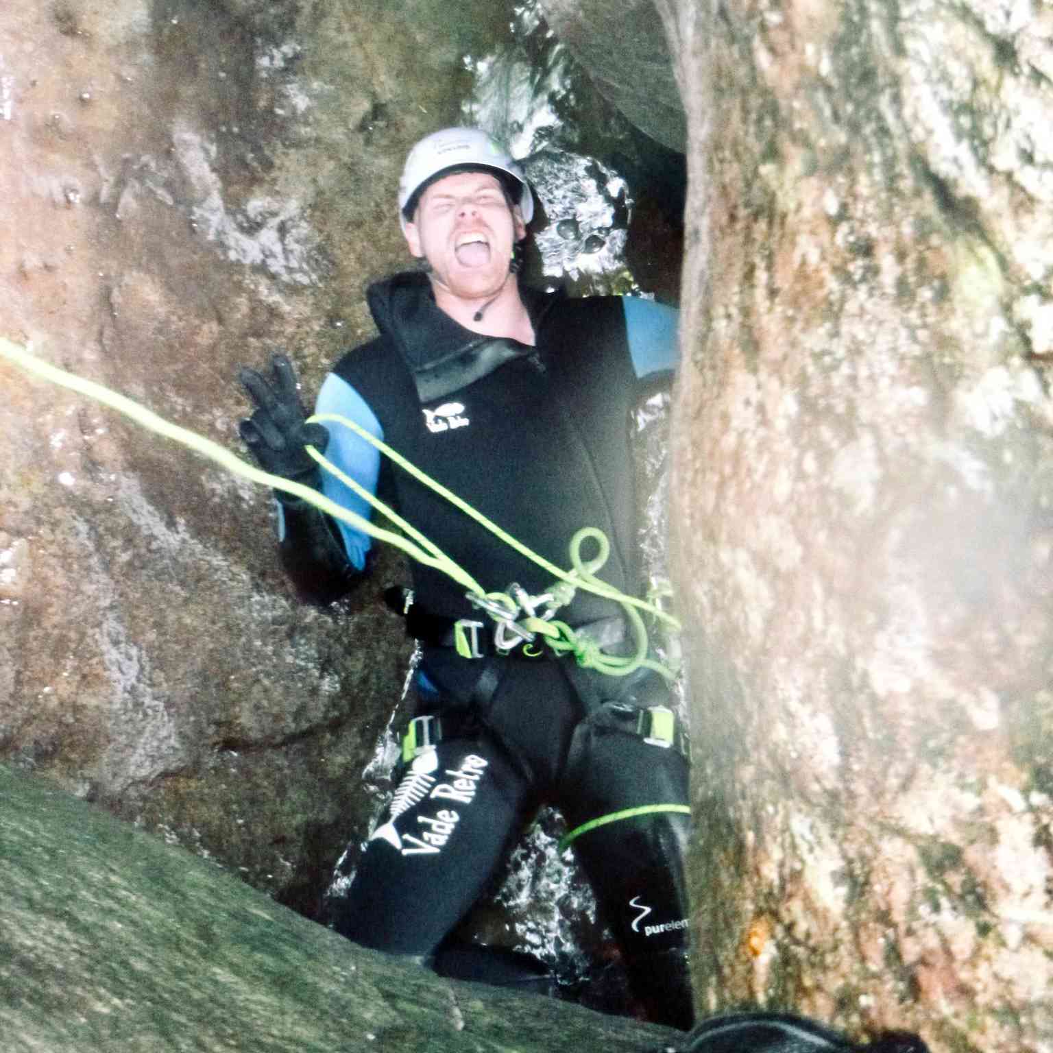 Het is eigenlijk best lekker om nog een rondje te rijden in deze mooie omgeving. Op onze nieuwe plek aangekomen check ik dan toch maar 5x of ik de helm heb vastgeklikt. Check. Rugzak om? Check. Handschoenen bij? Check. Touwen bij? Check. Na een wandeling over een heel smalle ‘weg’ door het bos, komen we aan op de plek waar we het water in gaan. Het water is echt zo koud. Even oefenen en bij de eerste oefening knal ik Rob al onderuit die een flinke smak maakt. Haha. Kan maar beter nu beginnen. De eerste hindernis: door een waterval heen abseilen. En die waterval is hoog! En die kracht van het water wat op je nek valt, is zo immens. Ik kan me niet herinneren dat ik ooit bang ben geweest in mijn leven. Maar als ik daar 10 meter hoog in een waterval hang, waar je ‘doorheen’ moet, is het anders. “Niet loslaten”, gaat alleen maar door mijn hoofd. Ik ben dan wel vastgezekerd met een touw aan een haak in de rots, mijn leven ligt voor mijn gevoel letterlijk in mijn twee handen. Want die houden het touw vast dat me verzekerd van een enge val omlaag. In een diepte van water, die je niet kun inschatten. Eenmaal in het water geplonst, blijkt het veel dieper te zijn dan ik had gedacht. Na wat gespetter gooi ik mezelf als een halfdooie vis op een grote rots neer. Ik heb wel 5 minuten verdwaasd om me heen gekeken tot ik Rob zie komen die toch aardig in de paniek schiet. “Waarom had ik dit ook alweer geboekt?”, schiet er door mijn hoofd. Anyway, de tocht duurt nog drie uur en ik vermaak me meer dan goed. Geweldig zelf! Onderweg springen we nog van een waterval af en kom ik op de één of andere manier niet vooruit gezwommen en word ik door de stroming steeds naar de waterval getrokken. “Rugzak af”, roept die Duitse. Geen idee wat het in het Duits is, maar ik verstond het maar al te goed. Op dat moment begrijp ik hoe mensen kunnen verdrinken. Jeetje. Maar wat hou ik van zo’n momenten – vooral als ik daarna hijgend op een rots zit met een grote glimlach op m’n gezicht. De tocht maken we mooi af, eindigend met een lange free slide van een natuurlijke glijbaan af. Als ik uit het water kom, staan er ongeveer tien mensen te applaudisseren! Cool!