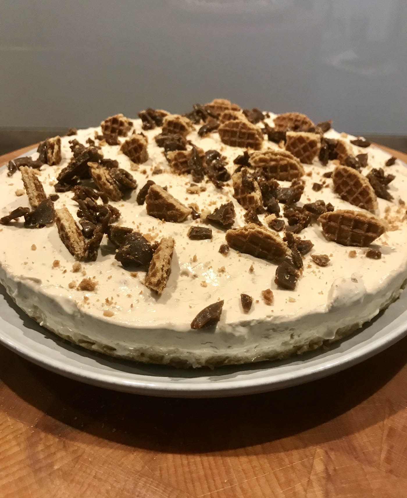 - En dan de dag erna: versier de bovenkant van de cheesecake met de karamel en nog wat verkruimelde stroopwafels.