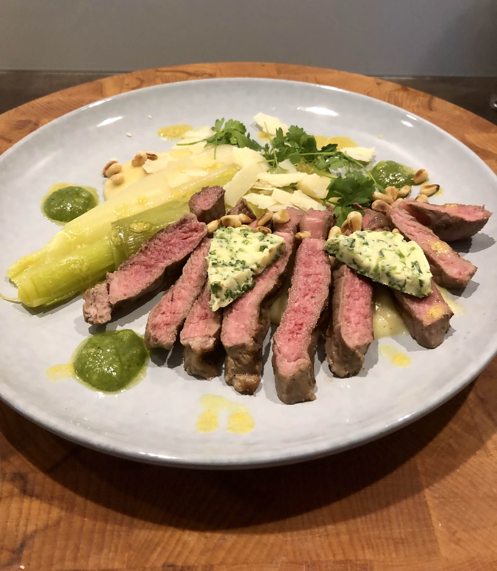 - Bijna klaar: het bord kan opgemaakt worden. Allereerst een mooie streep polenta, met daarop gesneden prei. Trancheer het vlees en leg dat op de polenta. Op het vlees wat kruidenboter, wat grof zeezout en er omheen druppels pesto en dressing. Ik heb er nog wat verse tuinkers uit eigen tuin bij gedaan en wat geroosterde pijnboompitjes voor de crunch! Afmaken met Parmezaanse kaas en klaar!