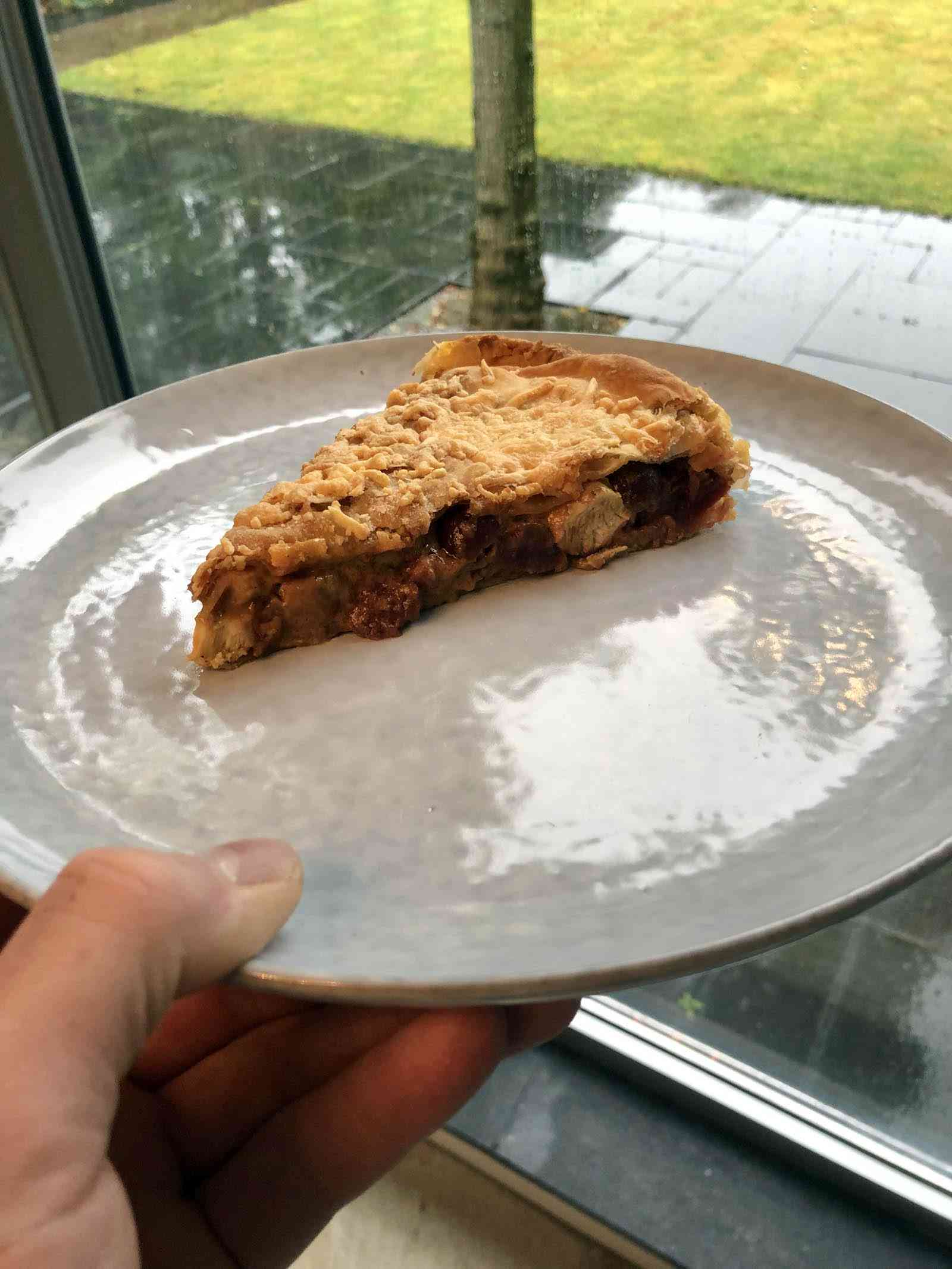 Maken! Bij een pastei bak ik altijd eerst de bladerdeegbodem een 10 minuten blind af. Je neemt een mooie vorm, bakpapier erin, bladerdeeg erin, bakpapier erop en dan bedekken met baklinzen – of wat je ook gebruikt om blind af te bakken) en dan de oven in op 220 graden. Ik heb een rol vers bladerdeeg uit de supermarkt gebruikt. Van de ‘afsnijsels’ heb ik nog een mooi deksel gerold. Laat vervolgens de kersen goed uitlekken. Snij de kipfilet in blokjes en bak deze goed aan en kruidt met peper en zout. Daarna de kerrie erbij en bak deze ook even goed aan. Snipper de knoflook heel fijn en voeg deze toe. Vervolgens snij je de stemgember fijn en voegt deze ook toe aan de kip, samen met de kersen, sambal en crème fraîche. Even goed laten doorpruttelen. Haal de bladerdeeg uit de oven en bedek de bodem met paneermeel – het mengsel is namelijk een beetje vochtig en hiermee zorg je ervoor dat je geen zompige bodem krijgt. Kaas erover, deksel erop en dan een half uur de oven in op 220 graden. Lekker!