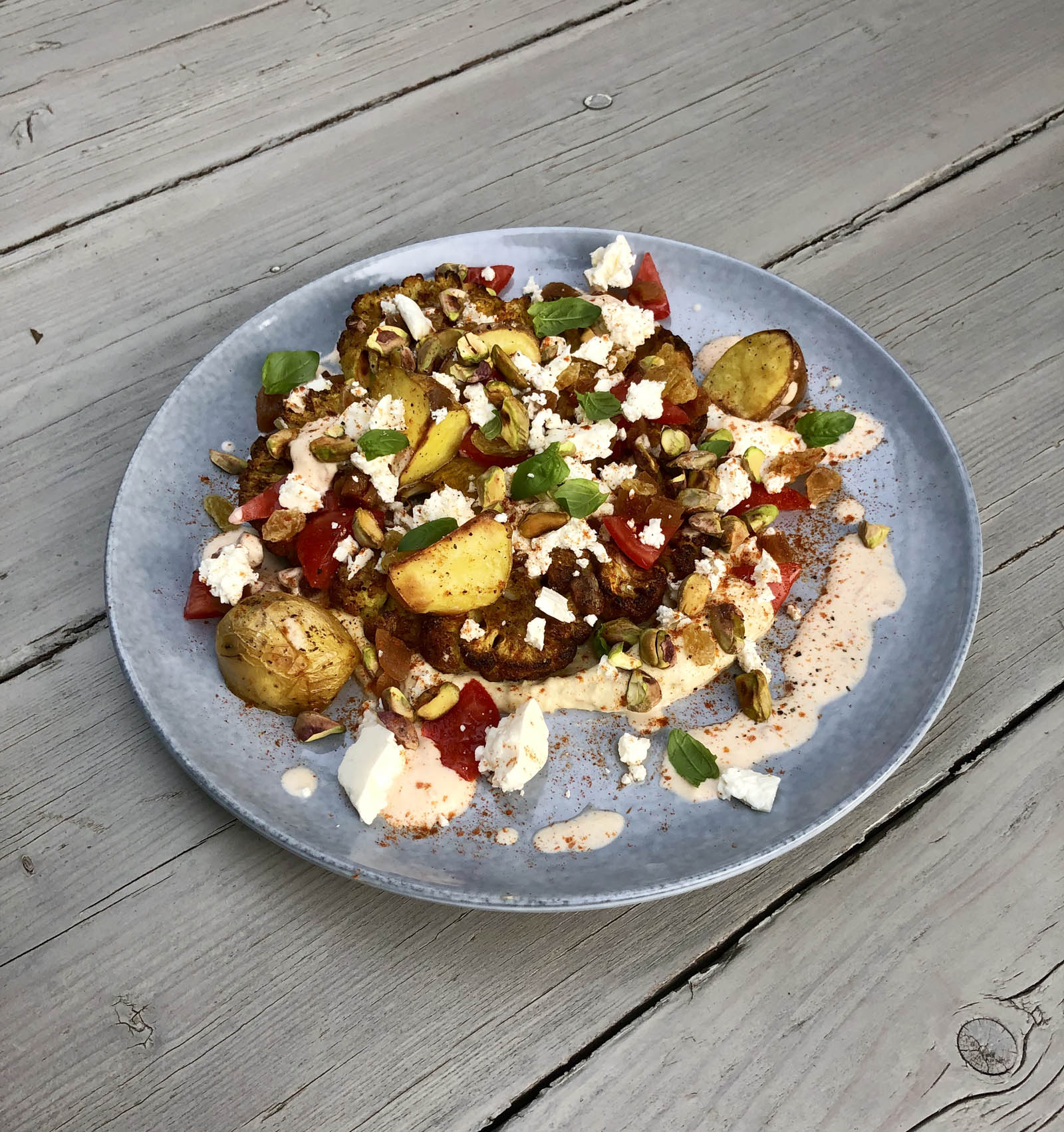Allereerst snij je een dikke plak uit een verse bloemkool. Ergens in het midden zit die nog mooi vast. Even drie minuten blancheren en dan kruiden. Met olijfolie, peper, zout, komijn, kurkuma, kerrie (ik heb lekkere Masala kerrie uit Nepal gebruikt) en kaneel. Goed inwrijven en dan voor 30 minuten de oven in op 190 graden. Snij ook wat aardappels in parten, scheutje olijfolie en doe die ook in de oven. En dan kun je wachten. Ik ben een rondje gaan rennen. Als het half uur om is haal je alles uit de oven. Hij blijft nog lekker warm als je de garnituur maakt. Ik heb er een goede lik houmous onder gedaan en wat crème fraiche. Daar bovenop de bloemkoolschijf en getopt met flink veel: geroosterde pistachenootjes, fijngesneden gedroogde abrikozen, gedroogde rozijnen, tomatenpartjes (zonder nat) en flink wat verkruimelde feta. Dan nog een dressing die ik heb gemaakt van crème fraiche, een beetje water, chilisaus en pittige harissapasta. Besprenkel die dressing er op het laatst over en maak af met wat citroensap en paprikapoeder! En wat fijne blaadjes basilicum – eigenlijk moet je munt gebruiken, maar die had ik niet meer. Comida sabrosa!