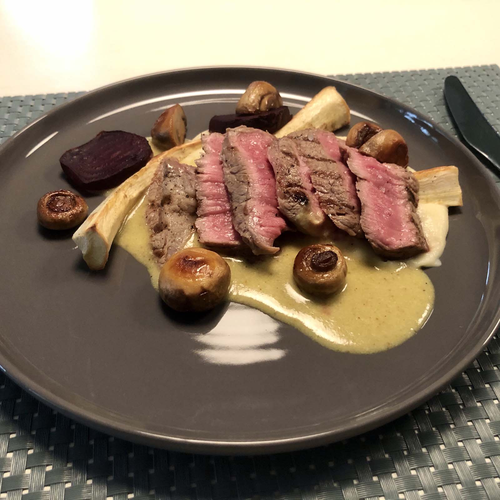 Knolselderijpuree met paddenstoelen, pastinaak, bietjes, ribeye en een saus van kerrie en knolselderij