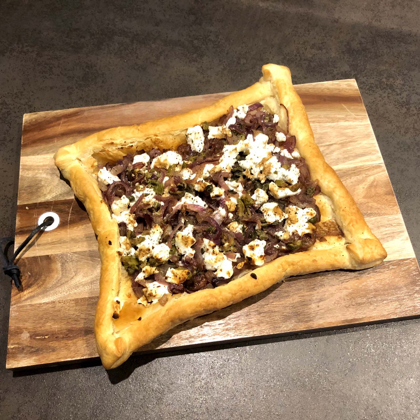 Maken! Als eerste ontvouw je de bladerdeeg. Maak de randen nat met wat water en sla de randen om. Prik gaatjes in de bodem en bak deze alvast eens voor 10 minuten af in een warme oven op 220 graden. Ik doe dat altijd – dan is de bodem al wat knapperig. Zeker als je daarna wat ‘vochtige’ vulling erop doet. Als de bladerdeeg in de oven staat snij je vijf rode uien in ringen en fruit die aan in een pannetje. Flink wat tijm erbij en goed roeren. Smoor door tot de uien lekker zacht zijn – ongeveer 10 minuten tot een kwartier. Bestrooi de bodem met de uien en brokkel er geitenkaas overheen. Snij wat kappertjes en olijven fijn en strooi deze ook op de plaattaart. Afwerken met flink wat zwarte peper en wat drupjes balsamico. Daarna nog 10 minuten de oven in op 200 graden en eten!