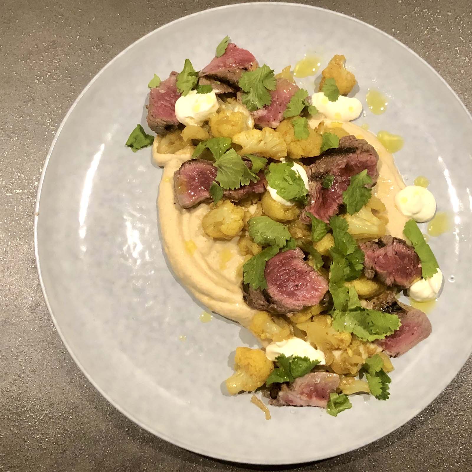 Houmous van knolselderij, gesmoorde bloemkool met ras el hanout en ribeye steak!