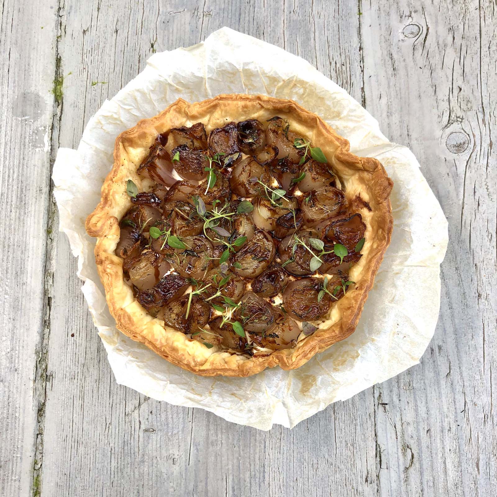 Sjalottentaartje met geitenkaas en balsamico-azijn