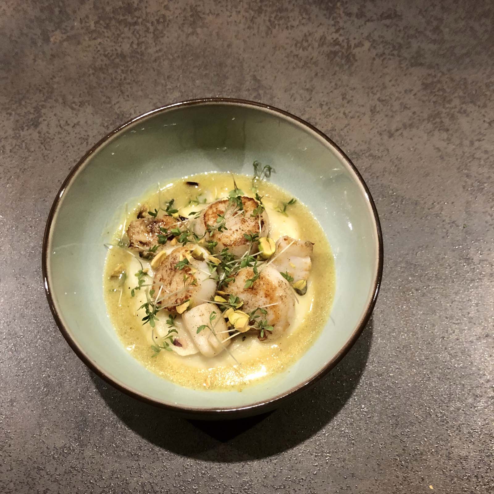 Coquilles met knolselderijpuree, geroosterde bietjes, gegrilde bloemkool en zachte kerriesaus