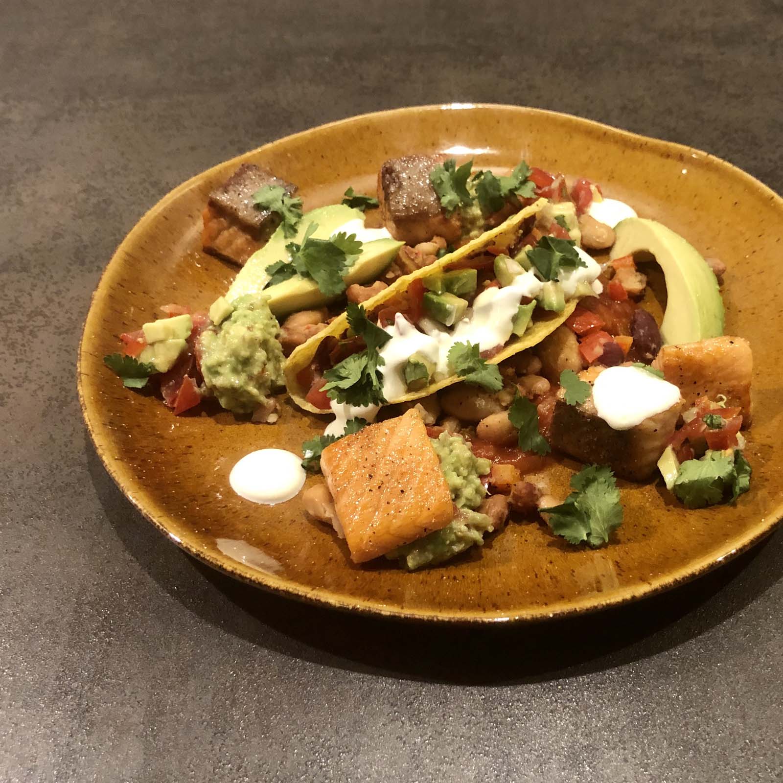 Taco gevuld met bonen en tomatensalsa, pikante tomatensaus, avocado, gegrilde zalm en limoendressing