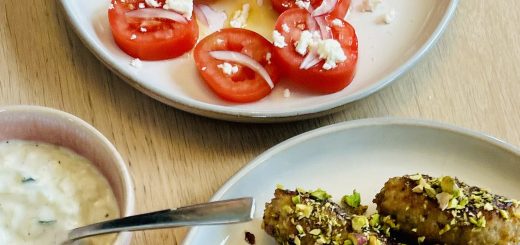 - Voor de gemarineerde komkommer: een halve komkommer, half rood pepertje, lepeltje sesamzaadjes, paar lepels witte wijn azijn, lepeltje sojasaus.