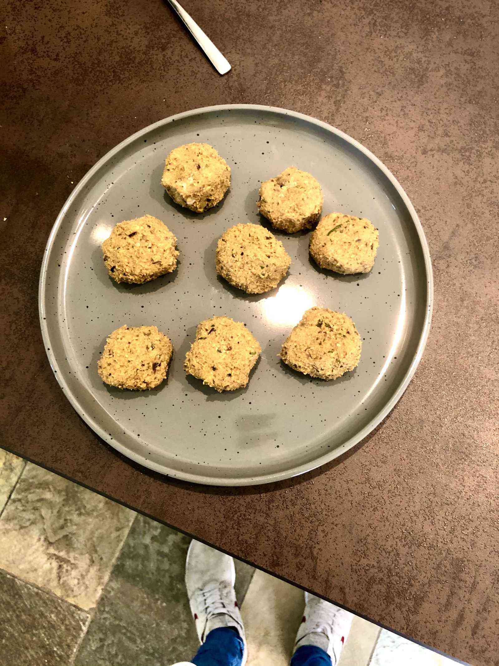 - Maak je handen nat en maak een stuk of 12 bolletjes van het mengsel. Druk ze een beetje plat en je falafel is klaar. Zet even afgedekt in de koelkast, dan stijven ze wat op. Handig als je ze later gaat bakken.