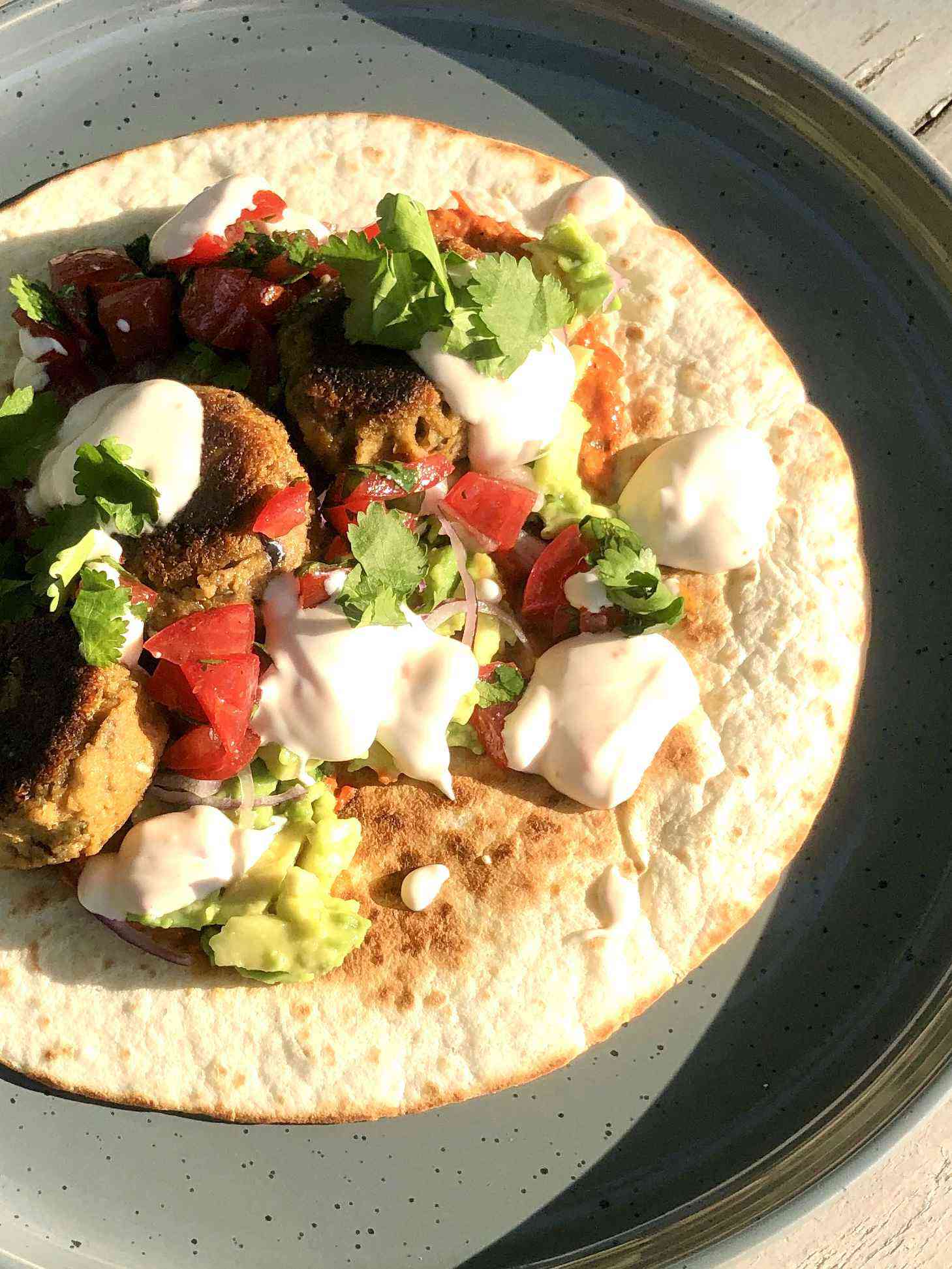 Tortilla met zelfgemaakte auberginefalafel, muhammara, avocado met limoen, salsa van tomaat en koriander, en een dressing met zoete chilisaus