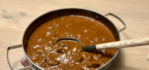 - De zoete aardappel is nu bijna gaar! Giet af, maar van het kookvocht op! Pureer de aardappel in een blender of met de staafmixer! Voeg eventueel wat kookvocht toe om het geheel lekker smeuïg te maken. Proef en kruidt eventueel nog wat bij met peper en zout. Zet maar even apart en dan afgedekt – de puree blijft lang warm!