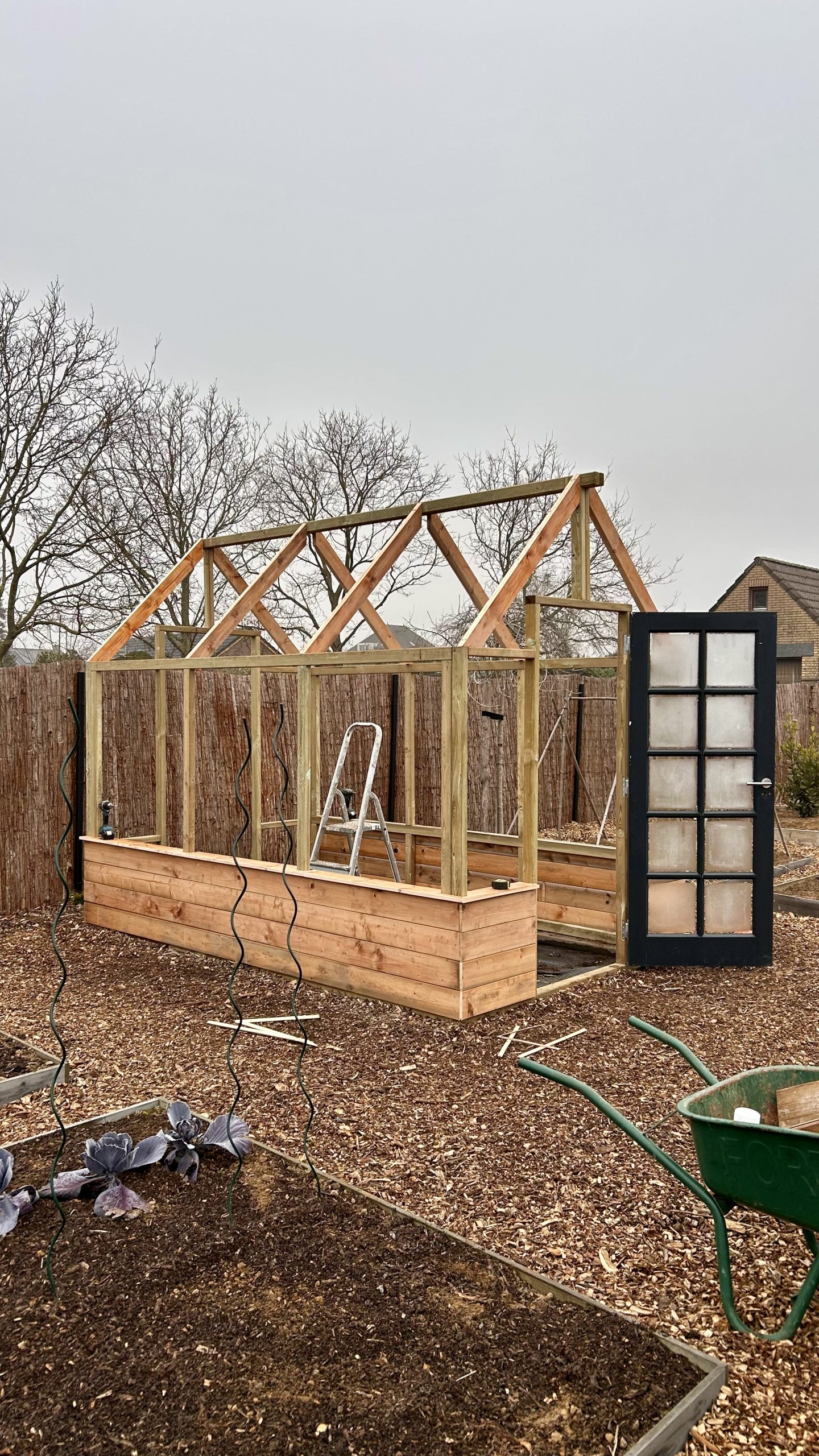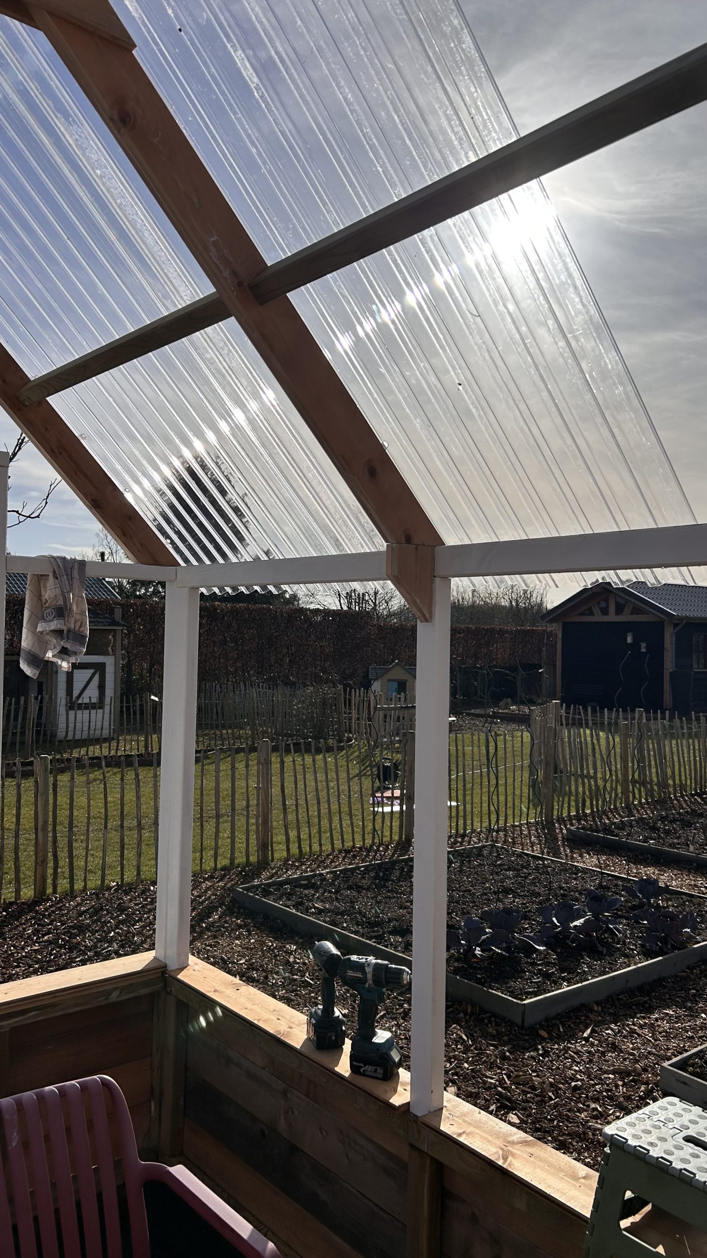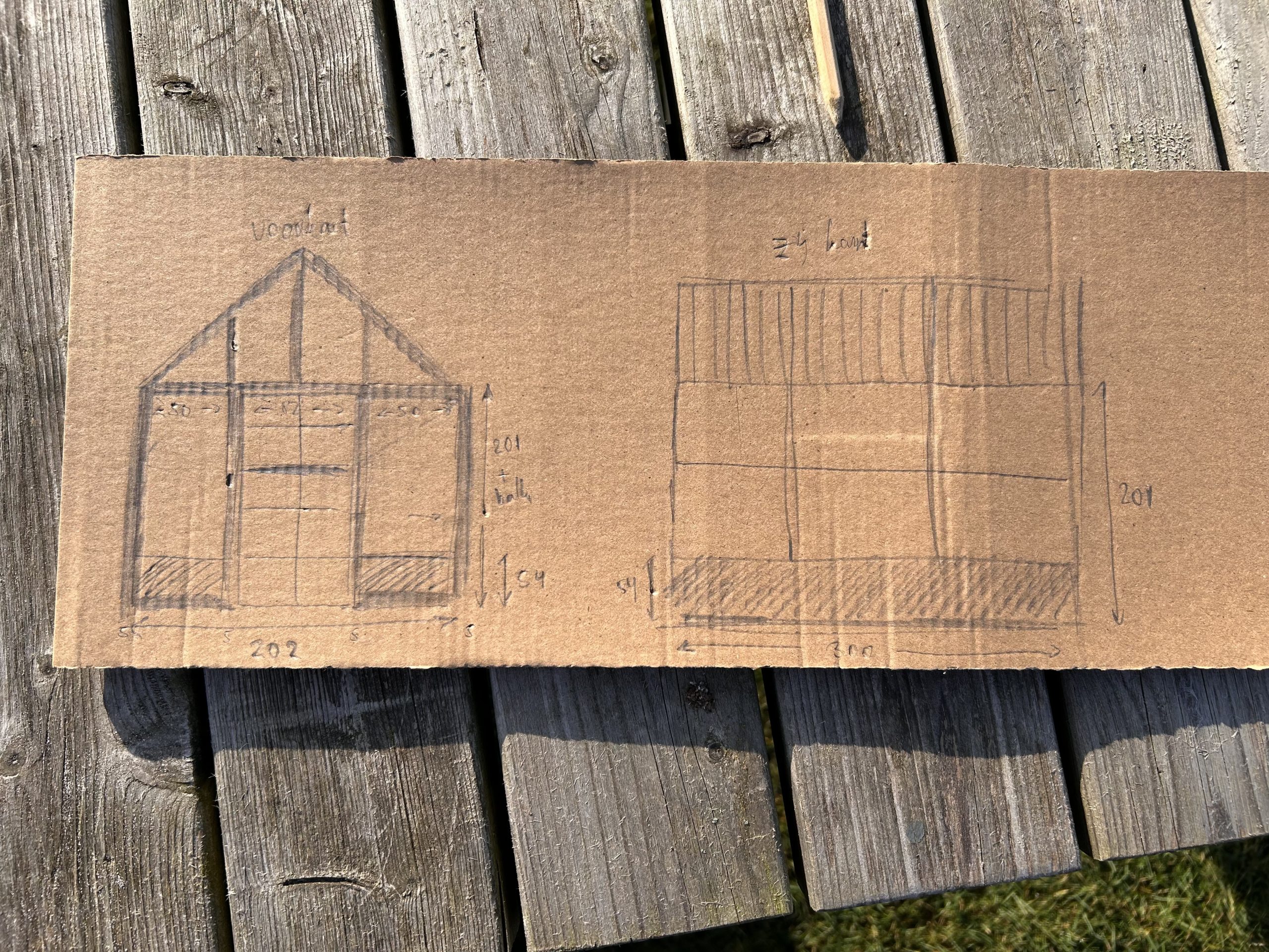 Onze tuin is een verhaal apart. Toen we in 2023 een groot weiland kochten van 2500 m2 zijn al begonnen met het aanleggen van de tuin. Terwijl de bestemming van het land nog agrarisch was en er nog geen schep de grond is was gegaan van/voor ons woonhuis. Nu, in 2026, hebben we een prachtig stuk grond. We hebben al een lange tijd een grote moestuin en willen graag een tuinkas hebben. Om tomaten, komkommers, sla, meloenen en pepers te kweken. Lea kijkt al tijden rond en online komen we steen dezelfde modellen tegen: aluminium frames met of glazen dak en ramen of van polycarbonaat. Maar als je een ‘goede’ afmeting kas wil hebben waar je ook in kan staan zonder je hoofd te stoten, komt je al gauw uit op 3000 euro. Dus beslissen we om er zelf eentje te maken. Een houten frame, want van hout kan ik ver maken, en eentje met een model dat we leuk vinden. In dit blog neem ik je hierin mee.