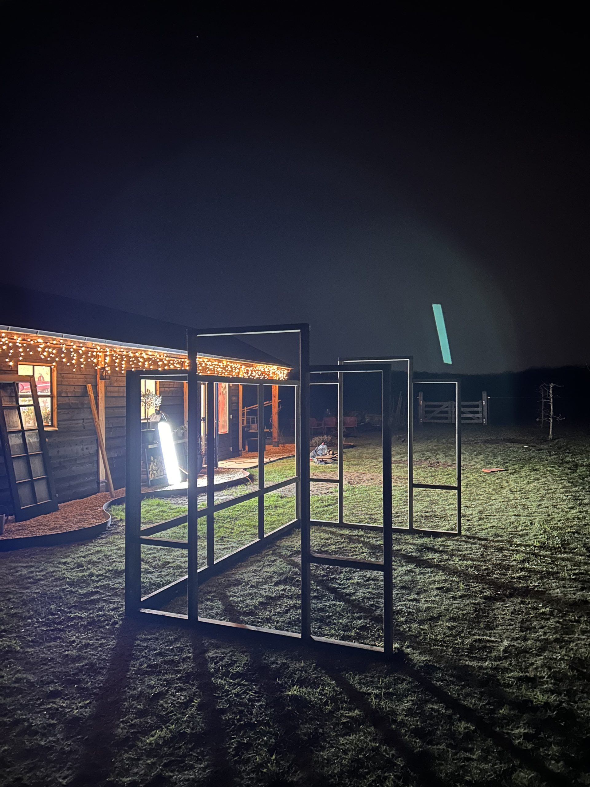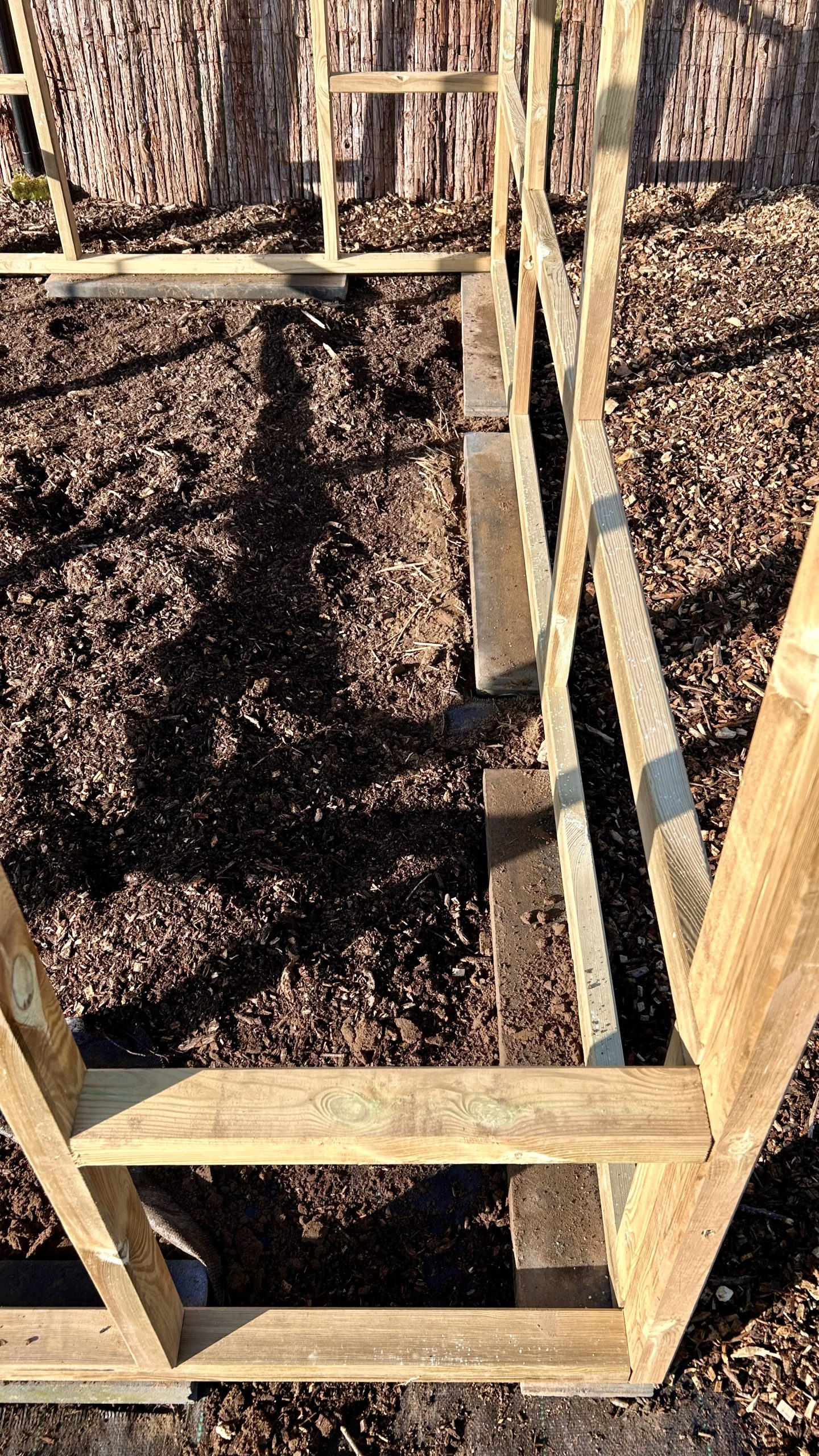 De frames voor de zijkanten zijn rechthoekig en vrij gemakkelijk te maken. Ik kies ervoor drie delen erin te maken, wat betekent dat er straks drie ramen in komen. Ik kijk online naar een gangbare maat polycarbonaat plaat en zie dat je die in de regel op 100 cm krijgt. Ik hou daarin per onderdeel 102 centimeter aan, meet af en zaag de balken op maat. Ook hier loopt er aan de onderkant een dwarsbalk mee waar de ‘lambrisering’ straks tegenaan komt. De frames maak ik in de avonduren van januari – het is koud en donker. Om een idee te krijgen hoe het huisje uit gaat zien, schroef ik de zijkanten tijdelijk vast aan de voor- en achterkant.
