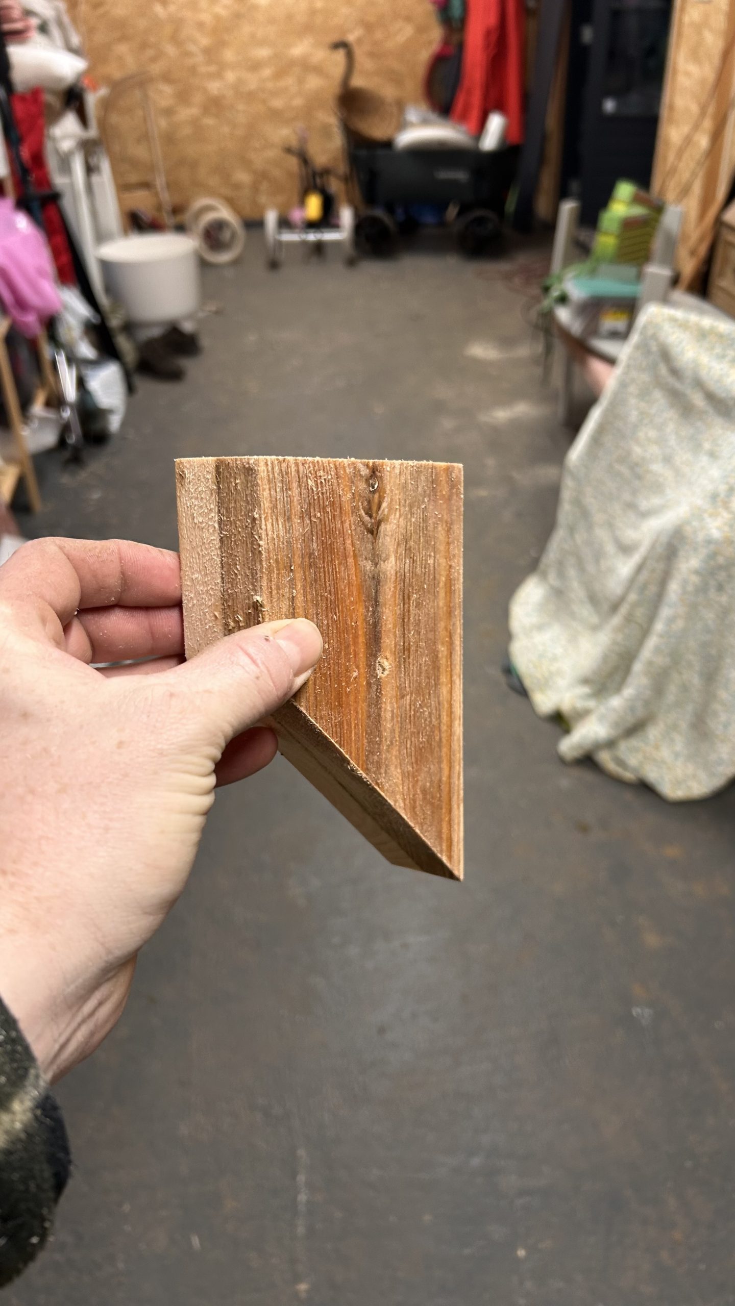 Dan is het tijd voor de spanten. Ik zaag de groef en tand van de rabatdelen af met de tafelzaag. Gebruik een oud stuk hout om te moeten hoe lang de spanten moeten worden. Je bevestigt ze namelijk aan de bok en schroeft ze op de bovenkant van het frame vast. Die maat vormt je langste deel van de spanten en zaag er hoeken aan van 45 graden (of iets kleiner, even proberen). Lijm tussen de twee planken, wat schroeven erin en dan bevestigen. In totaal maak je er acht.