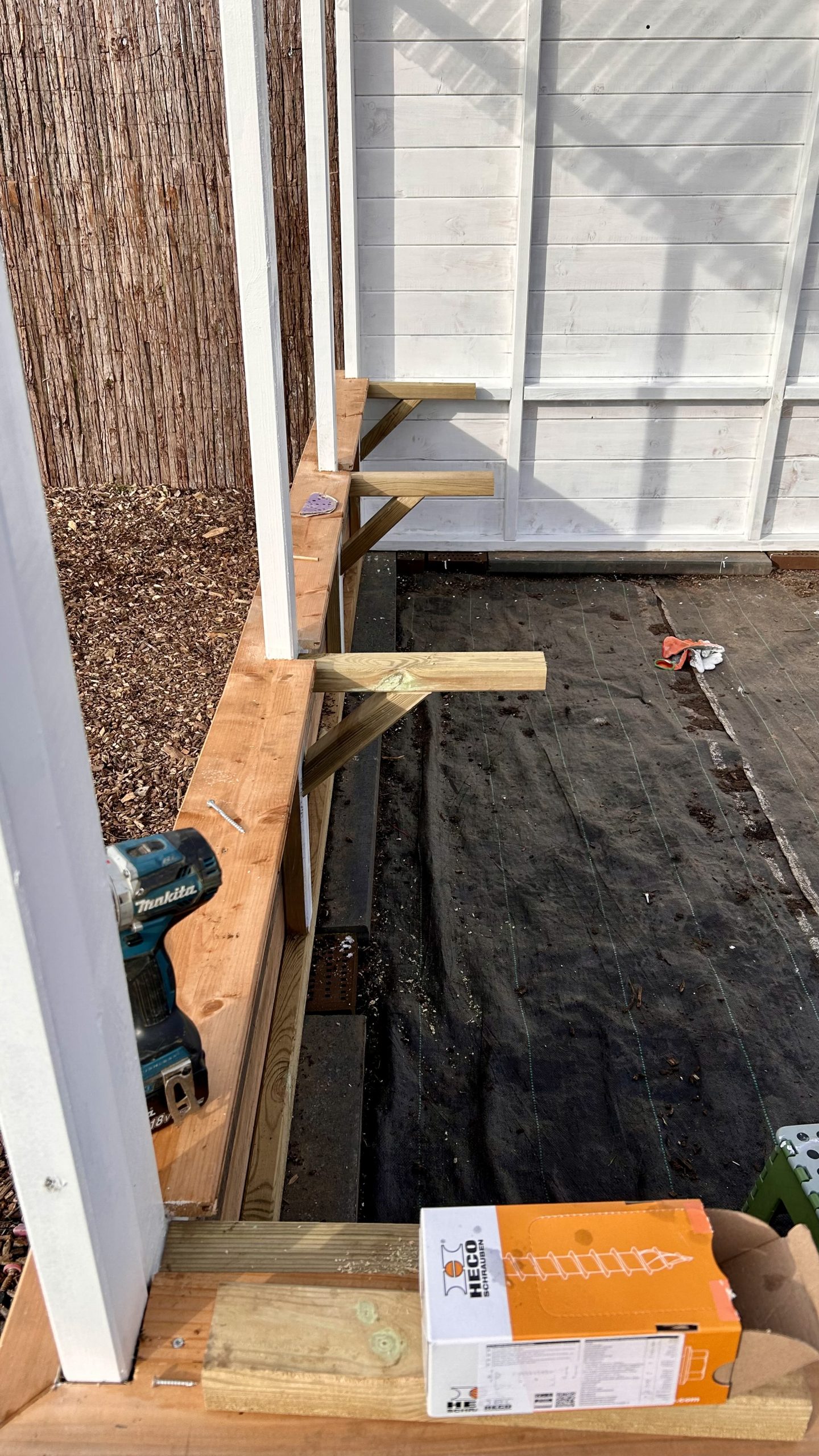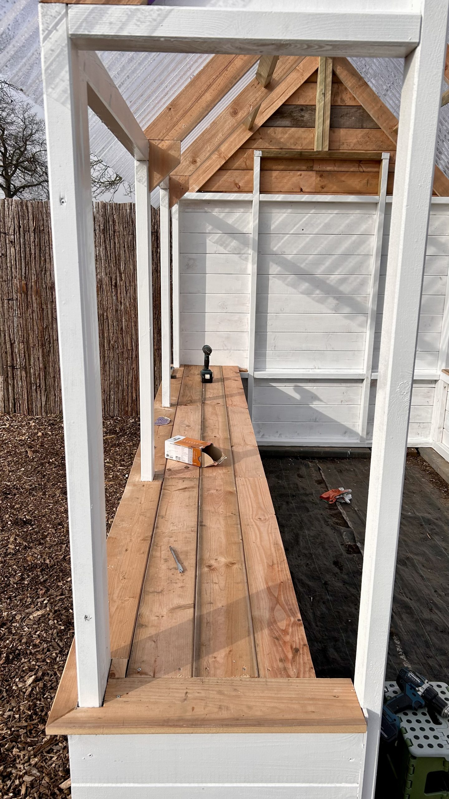 Aan de linkerkant komt er een lang werkblad waar allemaal planten en zo op gaan staan. Ook handig als tafel om te stekken. Ik maak als eerste een paar schoren die ik op vier plaatsen monteer. Het blad maak ik van drie rabatdelen waarvan ik de laatste de groef met de zaagtafel er vanaf haal. De planken passen zo netjes in elkaar, wat stevig is en het ziet er mooi uit. Tenslotte zaag ik nog een lange plank van ongeveer 10 centimeter die ik blind tegen de kopse kant aan schroef. Zo krijgt de tafel/bank een net wat robuustere uitstraling.