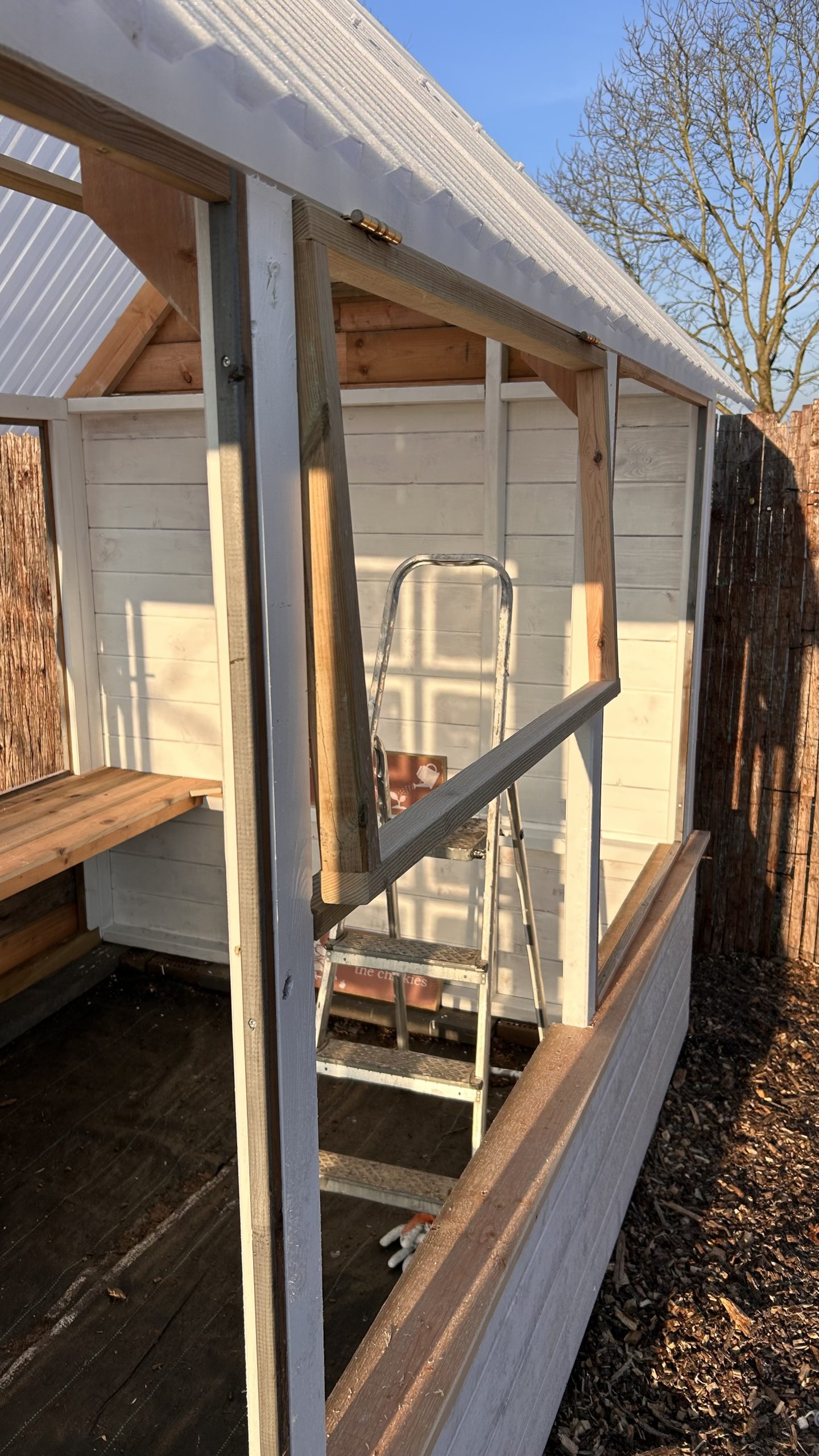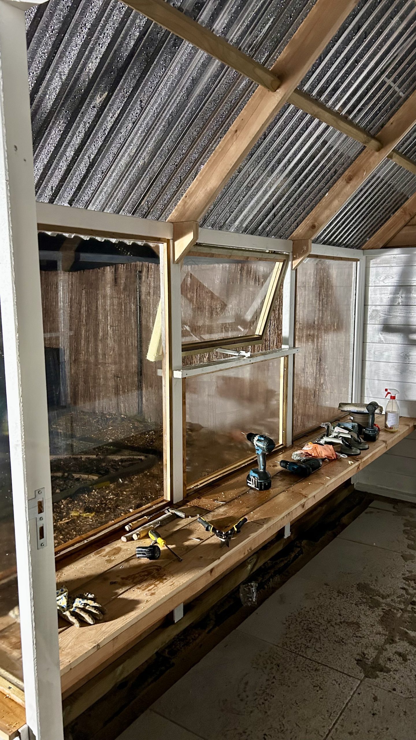 De onderste 50 centimeter van de kas timmer ik af met lange rabatdelen die ik nog heb liggen. Vier stuks hoog. In de avond maak ik er een mooie vensterbank op die iets uitsteekt naar de buitenkant. Hier komen straks de ramen op te leunen en dit geeft een mooi effect. Intussen schuurt Lea de goedkope deur voor de eerste keer wordt die in de grondverf gezet. Ook wordt de lambrisering en het kozijn voor de eerste keer in de grondverf gezet. We gaan voor de combinatie wit (frame en kozijn), hout (vensterbanken en dakspanten) en groen (deur). In combinatie met licht.
