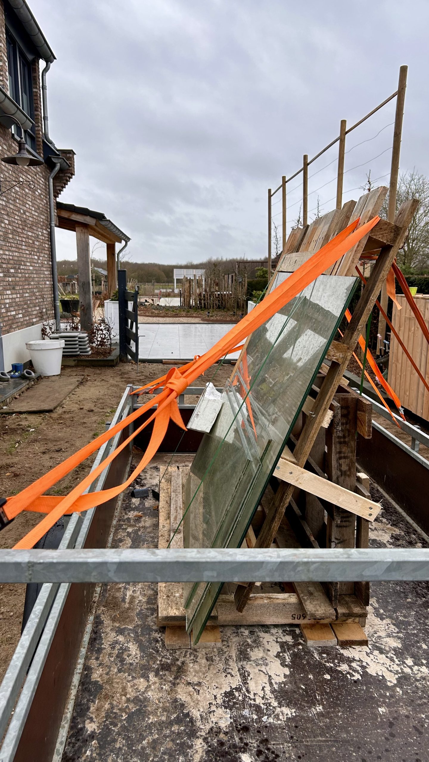 Na wat uitzoekwerk en het nodige belwerk kiezen we ervoor om geen ramen van polycarbonaat te nemen, maar van glas. Dat blijft mooi en verkleurd niet door het zonlicht en er komen geen krassen op. Wat daar zeker in meespeelt is dat een glazen ruit van ongeveer 130×100 net geen 8 euro kost, waar polycarbonaat in totaliteit honderden euro’s zou kosten. Ik meet voor de zekerheid de binnenmaten van de kozijnen driedubbel op en bestel het klas bij een bedrijfje dat handelt in tuinkassen in Someren. Let wel op dat je van de binnenmaat van elk kozijn per kant 5mm afhaalt, in verband met het kunnen werken van het hout. In totaal bestel ik 10 ramen, waaronder 6 grote ramen van ongeveer 120×100, twee ramen aan de voorkant van 100×50 en dan nog vier kleinere waaronder het glas voor de zelfgemaakte kantelramen in het midden van onze kas. Van drie kleine pallets maak ik een zelfgemaakte glasbok die ik met spanbanden vastzet op de aanhanger. Dat werkt prima qua vervoer en daarna is het tijd het glas erin te zetten. Hiervoor heb ik per raam 8 glaslatten op maakt gezaagd – ik zet ze aan de buitenkant van het kozijn als eerste vast, dan aan de binnenkant twee plastic glasplaatjes, waar vervolgs het raam op rust. Eerst met een glaslat aan de bovenkant (binnen) vastzetten en daarna de andere drie latten er tegenaan. Let op met schroeven en gebruik zeker geen slagschroeverdraaier! De ramen zet ik er in zo’n twee uur in waarna ik nog wat extra latten zaag om een vlakverdeling aan te brengen in de vier grootste ramen. Dit ziet er net wat klassieker uit en zorgt voor stevigheid, want het glas is slechts een paar millimeter dik.