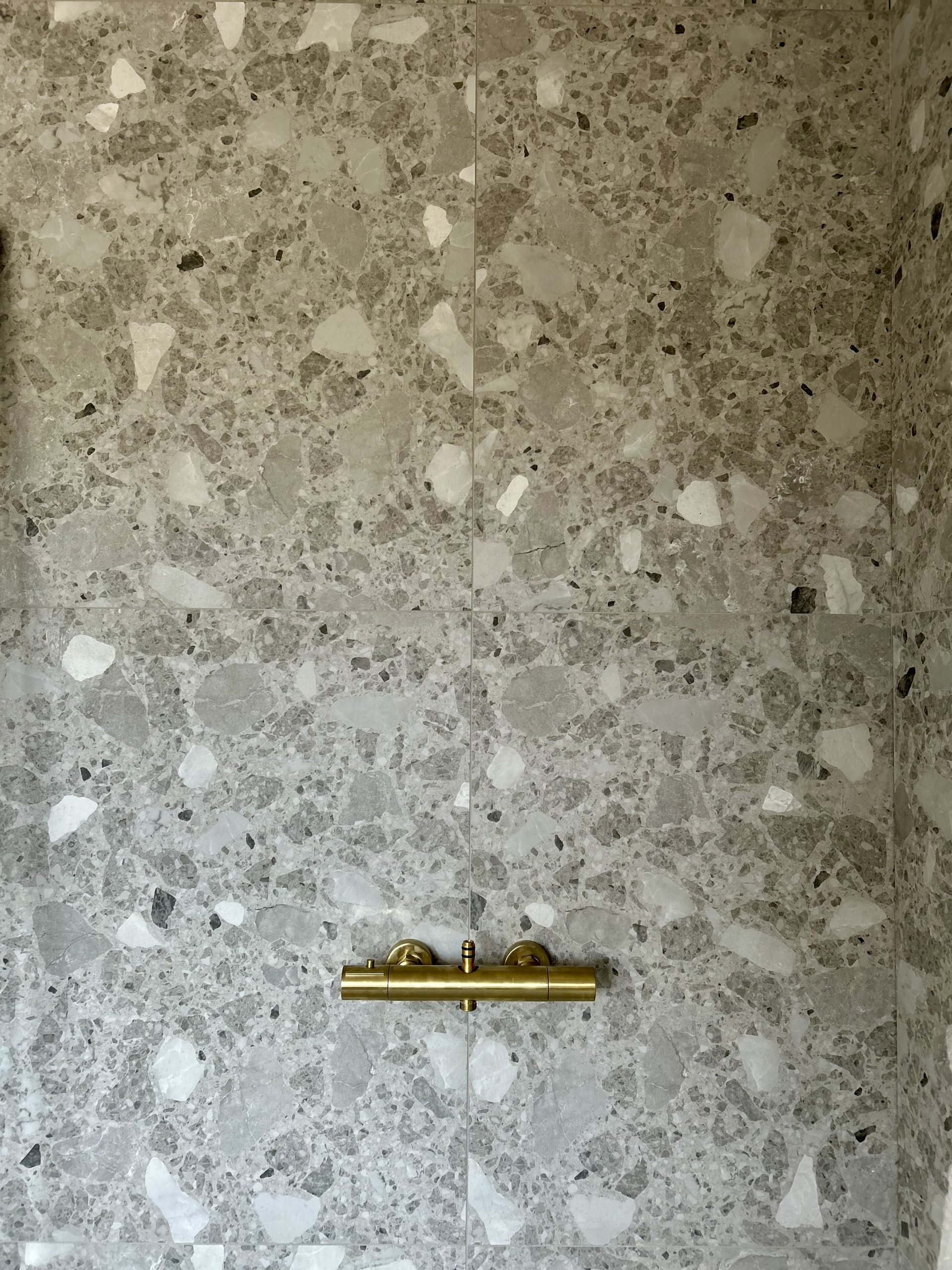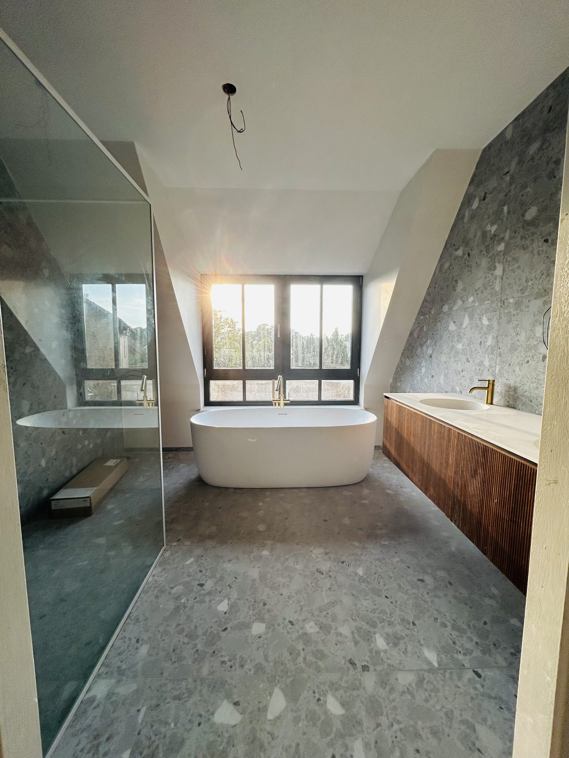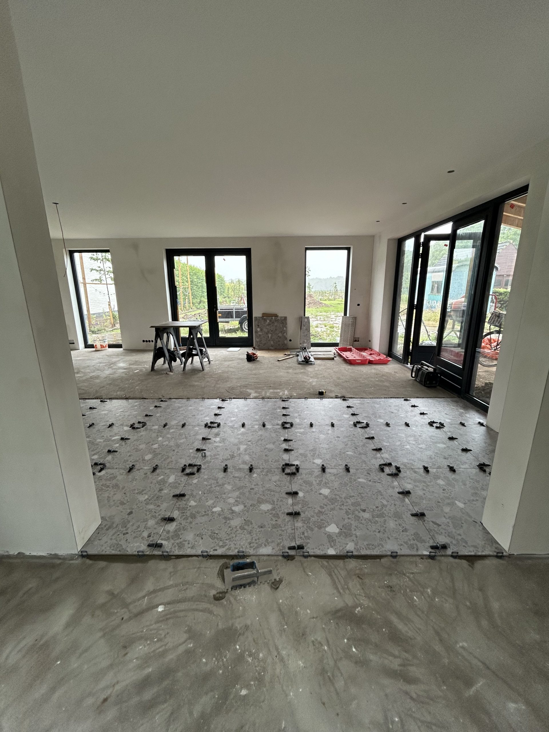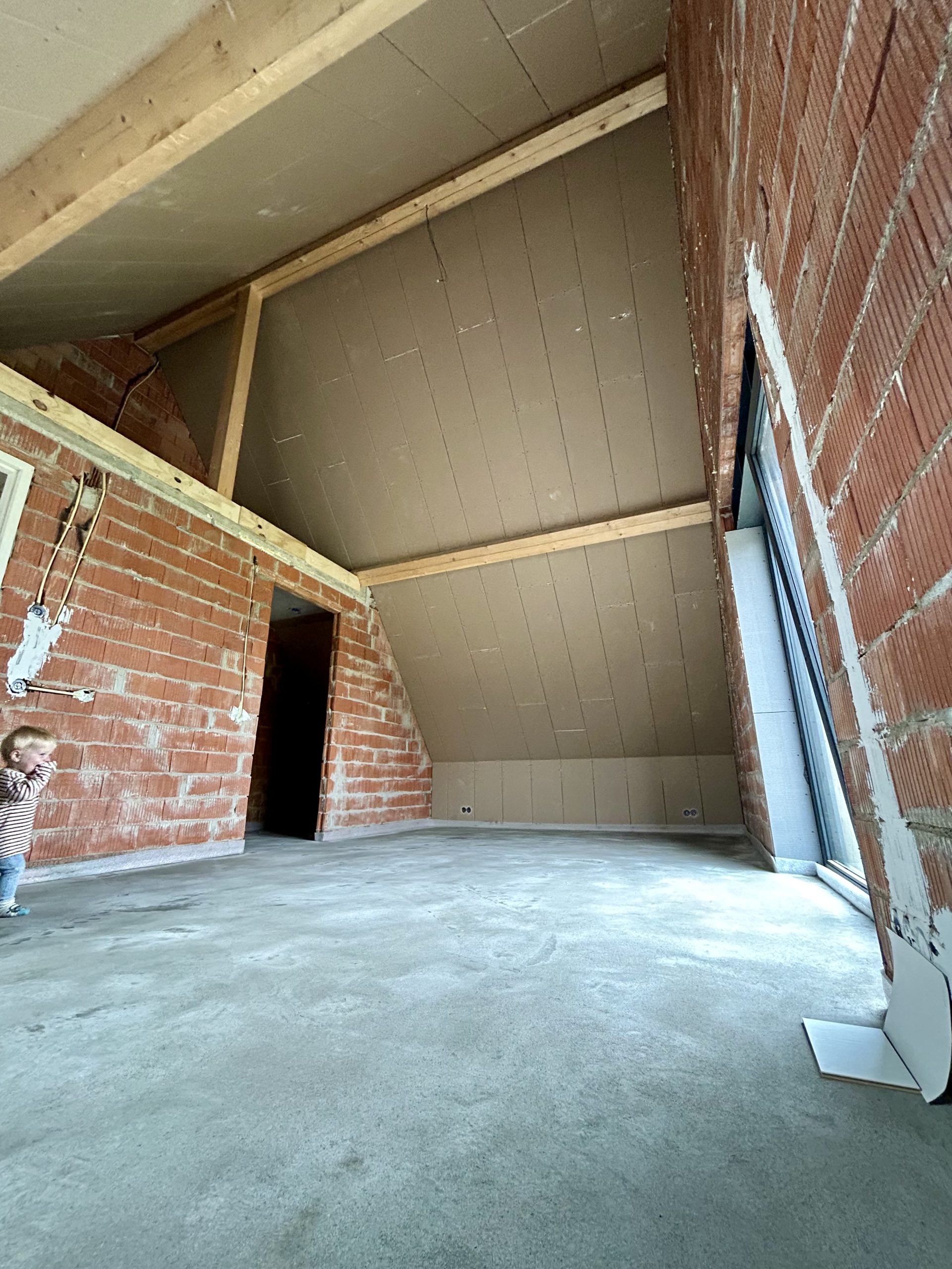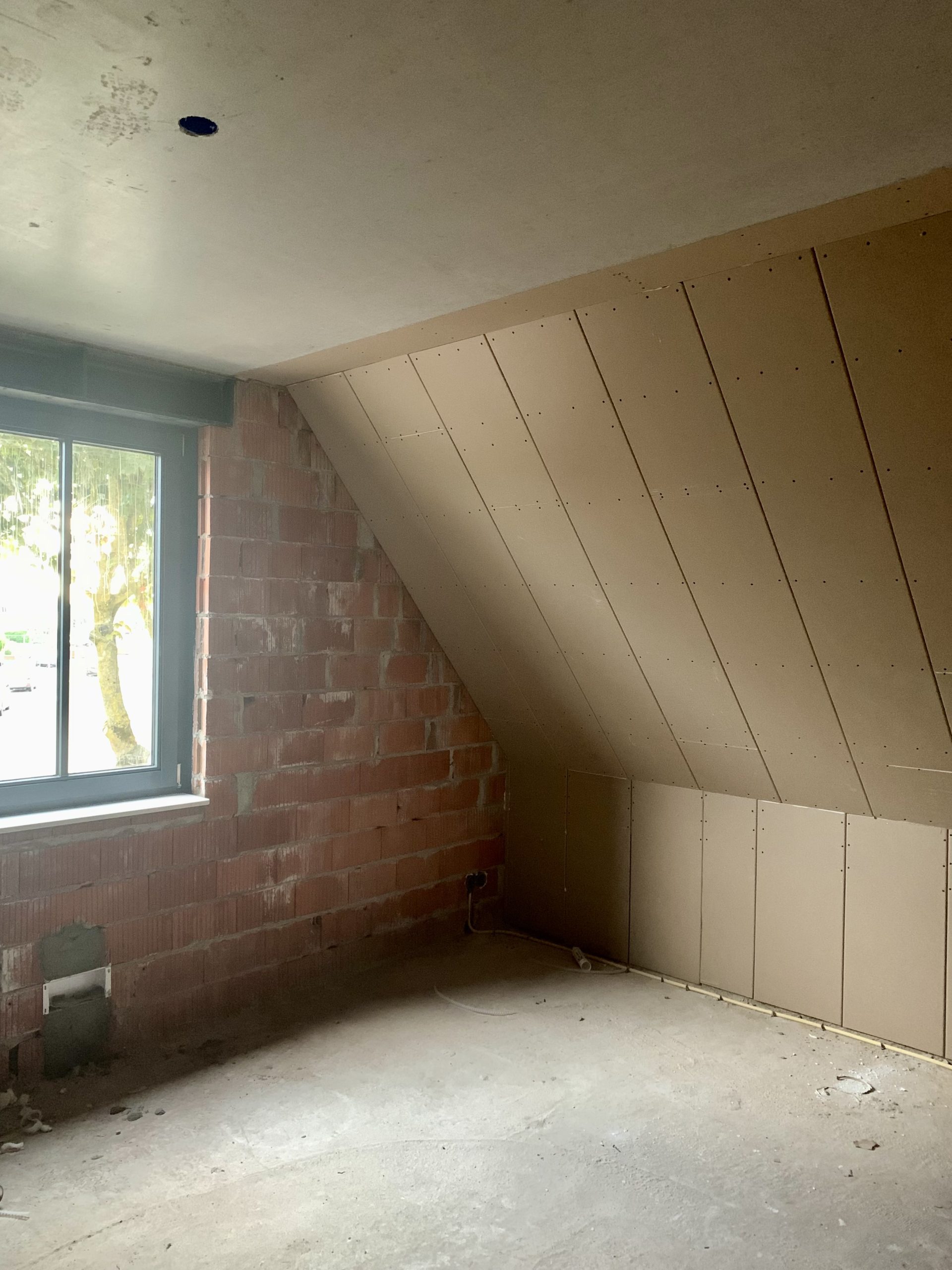 In de tweede week van juli (2024) is de stukadoor klaar. Het stucwerk binnen zit er super strak in en intussen is het hopen dat de cementdekvloer droog genoeg is omdat de vloertegels erin moeten. Doordat er wordt gestuct is de vloer afgedekt en daardoor kan de vloer niet goed ademen. Gelukkig komt het goed – zoals altijd – en is alles op tijd droog genoeg. Op dinsdag komt de tegelzetter (met vier man sterk) en drie dagen later ligt de hele vloer op de onderverdieping erin en is deze gevoegd. Ook is de wc onder betegeld. Geweldig. In het weekend is het dan eindelijk zo ver voor Lea: ze gaat zelf een muurtje tegelen met 10×10 geglazuurde gebakken tegeltjes. En tegen dit mooie muurtje komt uiteindelijk onze beste implusaankoop ooit te staan: het elektrische haardje. De week erop – tweede week van juli – maakt de stukadoor de cementplint buiten af, waardoor het huis bijna klaar is aan de buitenkant. En binnen nemen we zelf de eerste kamers onder handen. De slaapkamer van Jolijn wordt als eerste ververfd en ik behang twee muren. Het is nog een goede zoektocht om de kleur van de muren en plafond uit te kiezen. Uiteindelijk hakken we de knoop door; het wordt een Flexa kleur en wel Gentle Stone. En voor ik het vergeet: we beslissen ook nog even tussendoor om op de zolder laminaat te leggen, zodat we het ook daar direct netjes hebben. Alleen hebben we daar geen cementdekvloer laten storten. Maar met een kapkamer, handveger en blik kom je een heel eind om de vloer waar nodig te egaliseren. Binnen een drie dagen ligt de vloer netjes op de zolder. Mooi zo.