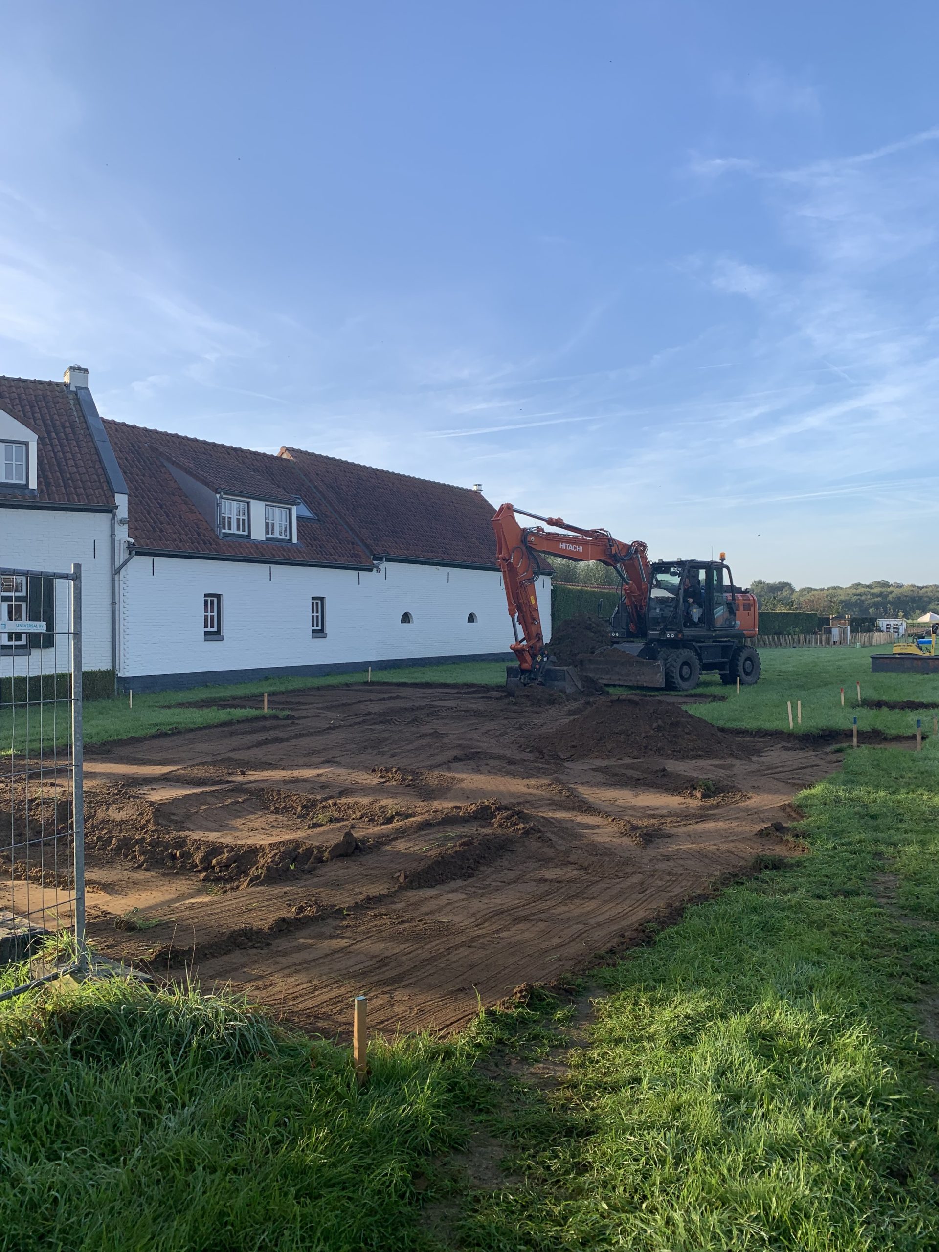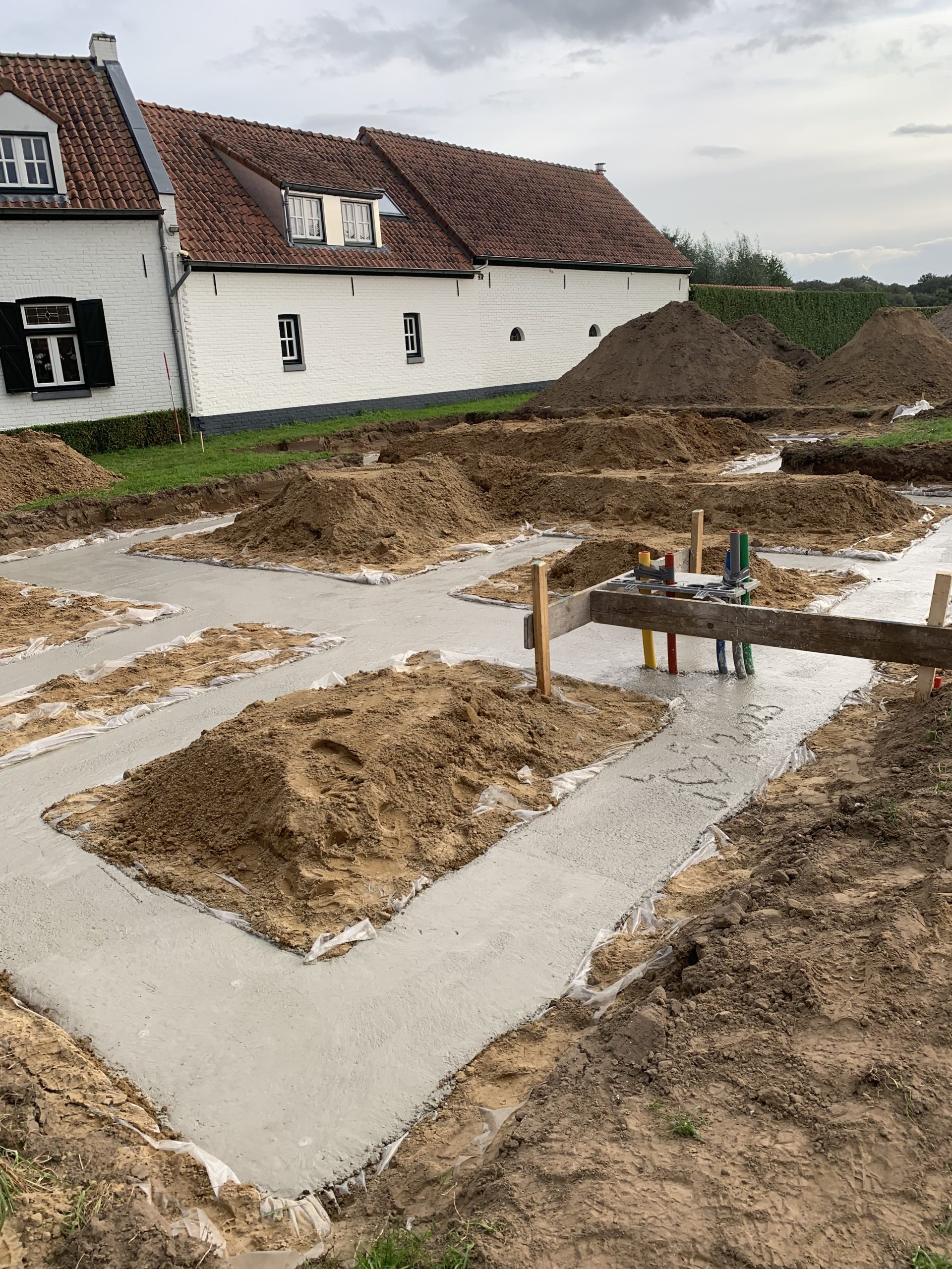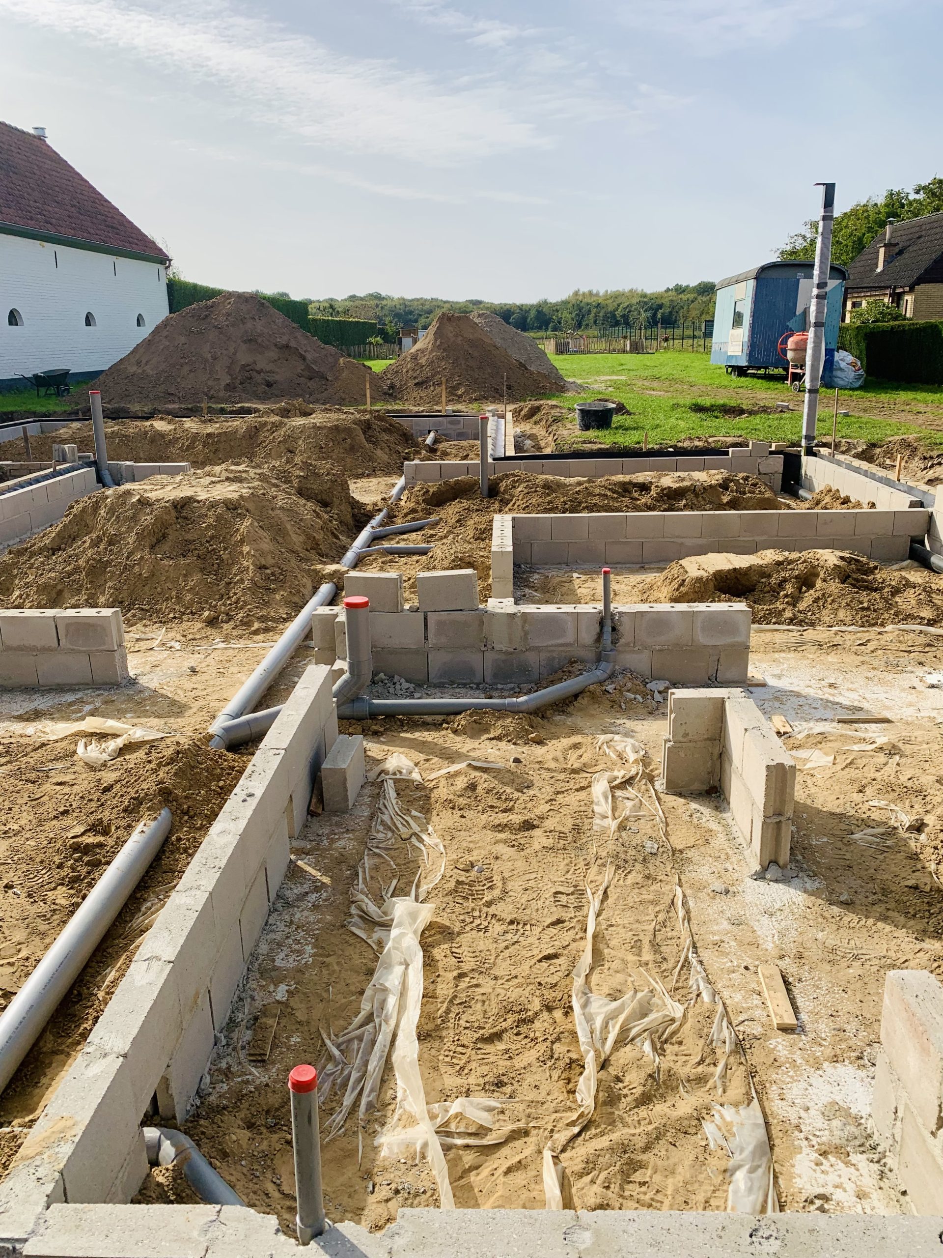 Op maandag 2 oktober 2023 start onze bouw! Als eerste met het grondwerk, al waren de paaltjes en alles al de weken ervoor uitgezet (net als het peil). Voor de muren wordt eerst de fundering gestort, waarop de eerste stenen worden gemetseld. Binnenmuur, folie, tempex en de buitenmuur. Dan volgt de installateur met riolering, warm en koud waterleidingen, leidingen voor de warmte-installatie en de eerste elektriciteit. Op een zaterdag halverwege oktober leggen we met een paar man tempex. Bedoeling is dat we grote platen als ‘vloer’ leggen. Dat betekent passen en meten en zagen – er staan immers als buiten- en binnen muren. Het is een leuke klus die binnen een paar uur is gepiept. De week erop worden eerst grote, blauwe pijpen aangelegd voor de wtw-installatie en daarna wordt de fundering gestort over de tempex heen. Ofja, er liggen ook staalmatten en bakstenen in.