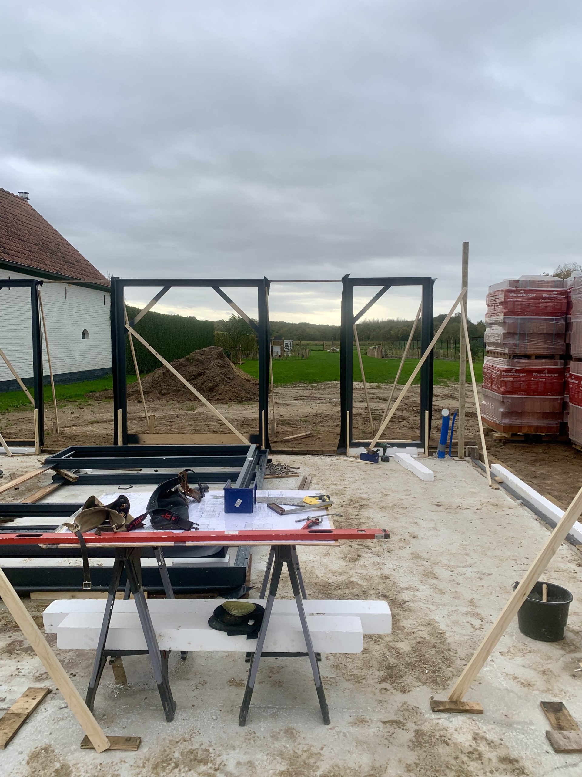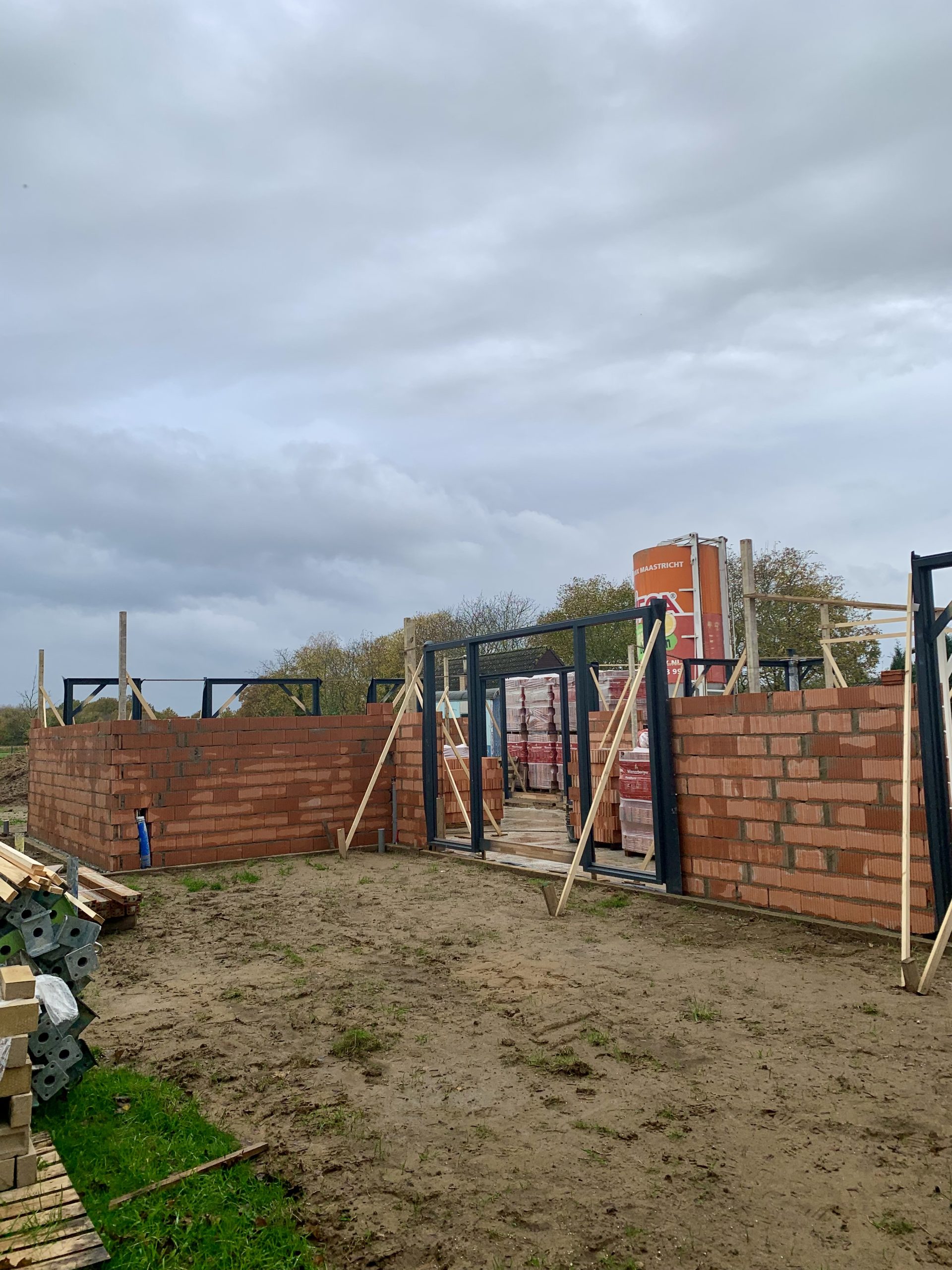 Op 1 november arriveren de kozijnen en die worden in deze week gesteld. Dit houdt in dat ze op de plaats gezet worden, waarbij houten latten ze precies op de juiste plaats houden. Ook de stenen van Wienerberger voor de binnenmuren arriveren. Het begint nu echt wat te worden. De muren worden uitgezet met houten plaatjes en de eerste muren worden gemetseld. Ook arriveert de grote betonmixer – want ja zonder specie kan er niet gemetseld worden. Halverwege november staan alle kozijnen en de binnenmuren voor de helft overeind. Het is leuk om via de voordeur naar binnen te lopen en een rondje door het huis te maken.