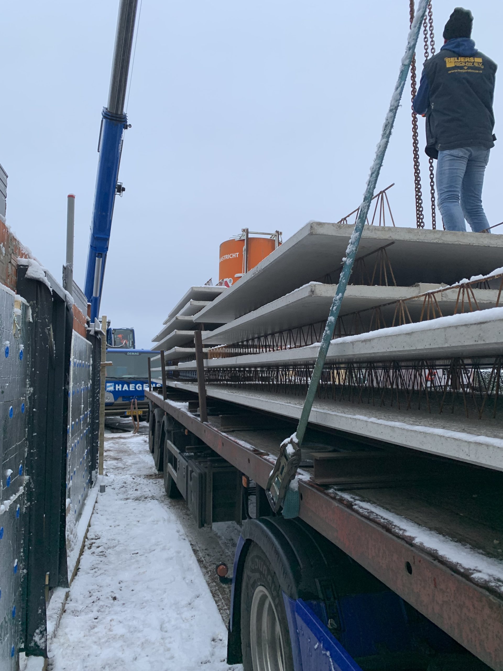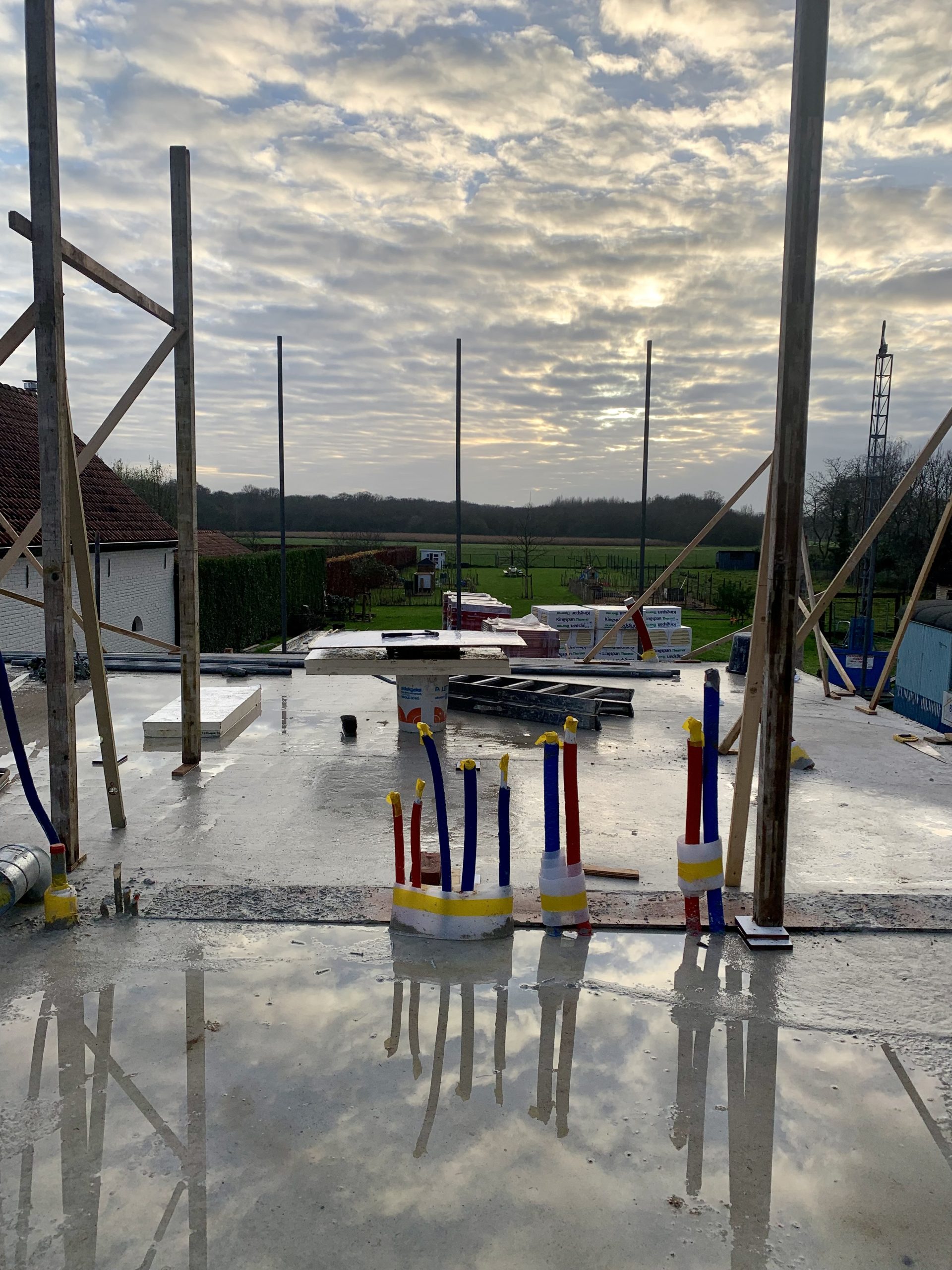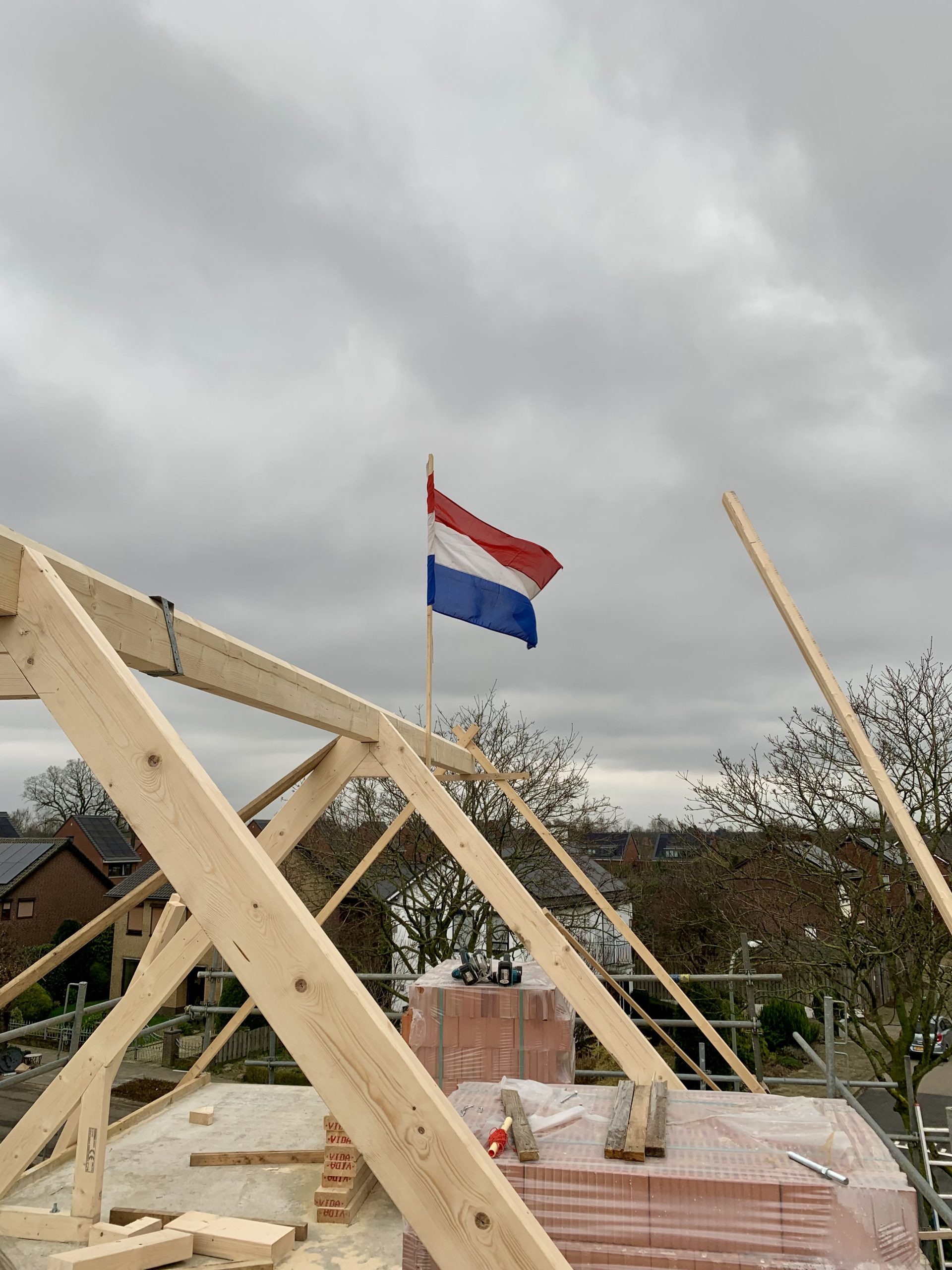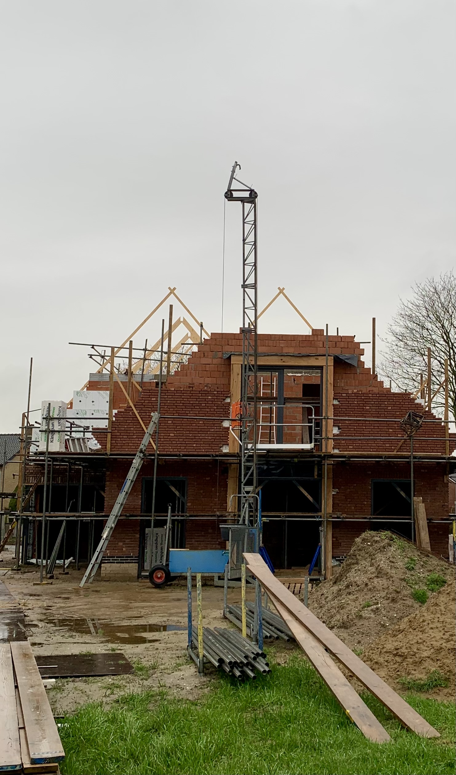 De eerste weken van februari zitten er alweer op en er wordt hard doorgewerkt aan ons mooie huis! Zo zit de zolder er op en is van alle leidingen die op deze verdieping aanwezig zijn, niks meer te zien. Die liggen inmiddels veilig opgesloten in het beton. Ook is er behoorlijk gemetseld. De gevels zijn verder opgetrokken en versieringen zijn hier en daar ook al zichtbaar. Van die ‘trappetjes’ waar het schuine dak begint. Daar bestaat vast en zeker een mooie naam voor, maar die kennen wij (nog) niet. Deze week hebben we ook alle binnendeuren uitgezocht. Elf stuks in totaal, plus nog eens een dubbele taatsdeur die tussen de keuken en woonkamer komt en een enkele taatsdeur vanuit de hal naar de keuken. Cool hè: Het is echt leuk de voortgang te zien en we sluipen dan ook geregeld ons nieuwe huis binnen om nieuwsgierig te kijken hoe alles eruit ziet en voelt. Ook zijn inmiddels de eerste dakspanten geplaatst en wordt meer en meer zichtbaar hoe het dak er straks uit komt te zien. Vandaag was verder nog erg bijzonder, want de grote, robuuste eiken balken zijn geplaatst aan de achterkant van het huis. Die omlijst de openslaande deuren in de woonkamer en de grote raampartij op de grootste slaapkamer erboven. Geweldig om te zien en wat een vakmanschap!