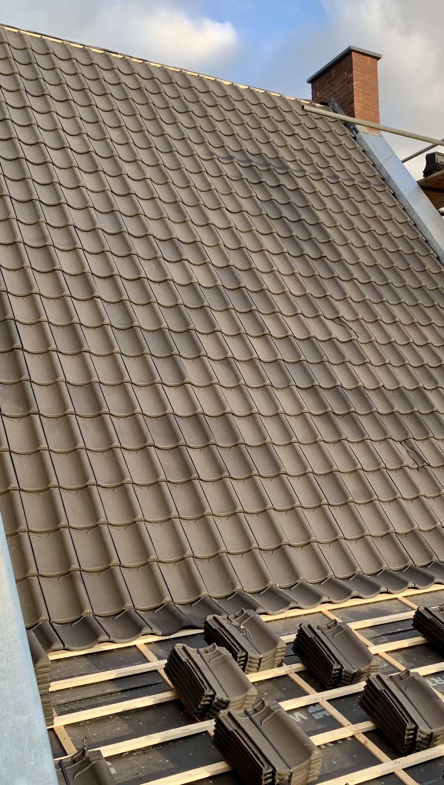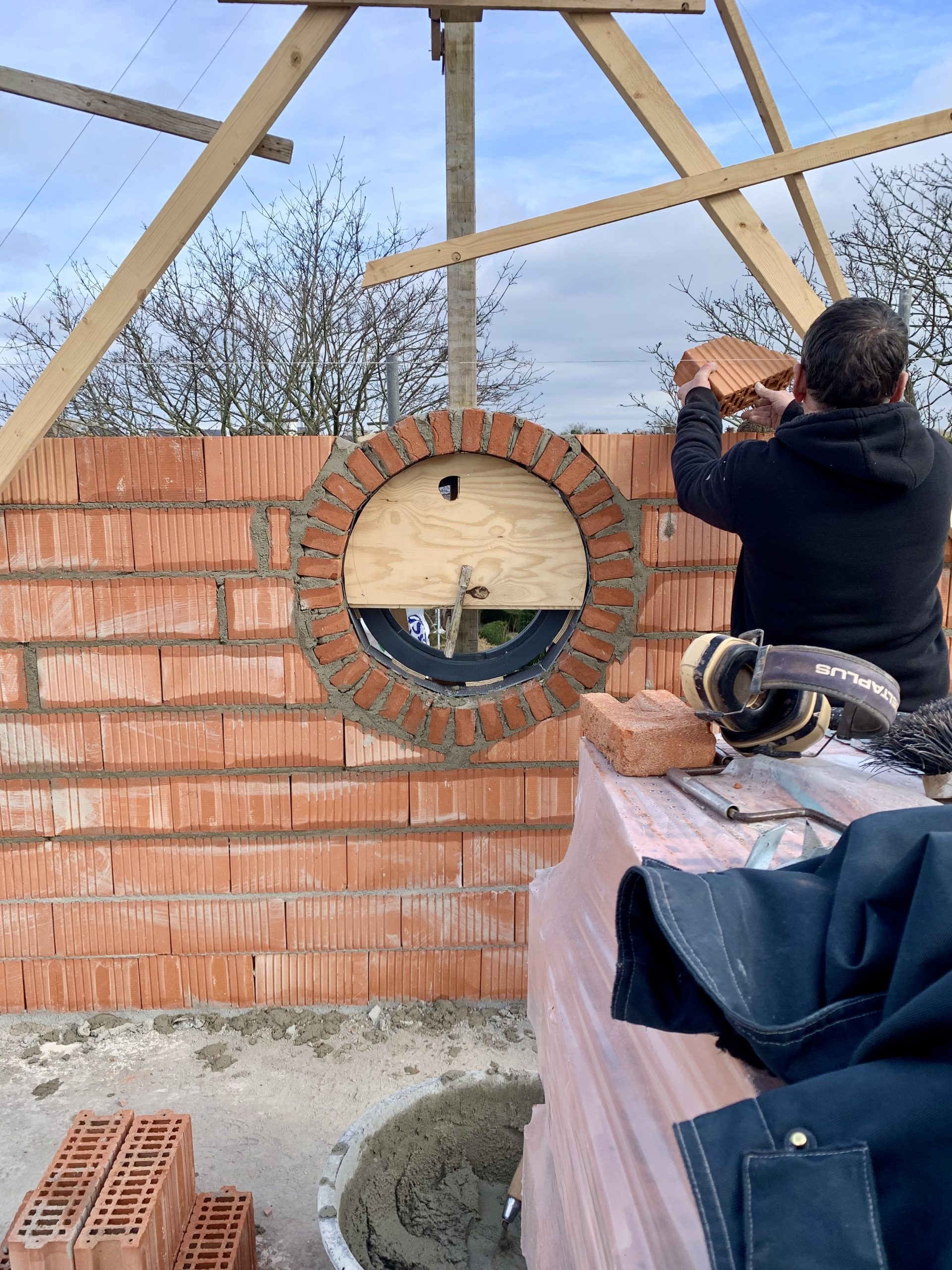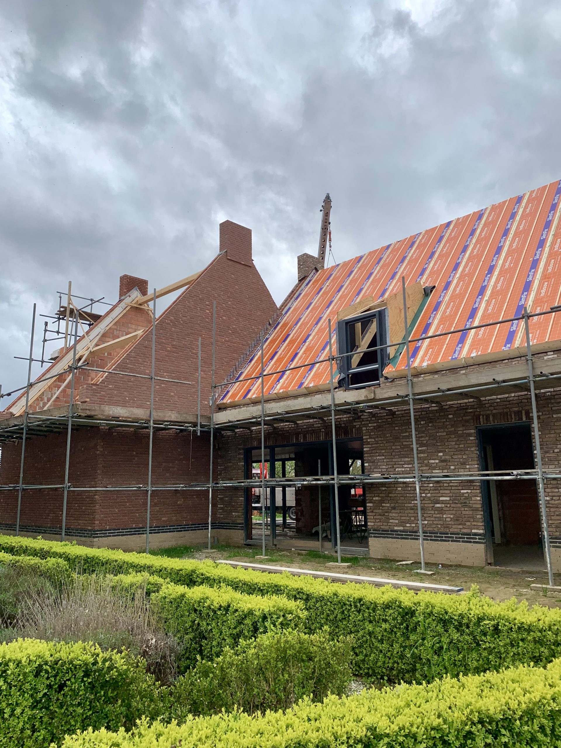 Het is inmiddels vijf weken na het faillissement en vier weken na de deal met de curator. Het is half april (2024) en we hebben de eerste twee bbq’s op de kavel achter de rug. Maar: er zijn ook bakken met regen gevallen. Maar buiten dit alles: het gaat goed met de bouw! Als eerste zijn de nieuwe metselaars gekomen en hebben in een dikke week de ontbrekende gevels en schoorstenen gemetseld. Yes. De week erna staat een ploeg klaar met kraanwagen en worden in twee dagen alle dakplaten op het huis gelegd. Yes! De topgevels worden afgetimmerd met betonplex en de boeiborden komen er tegenaan. En ook heel mooi is dat onze eiken overkapping staat. Op mooie hardstenen voeten. Het is een aardige joekel qua overkapping – hier gaan we zeker weten flink wat tijd onder vertoeven. Ook zit het zinkwerk op het dak. Op de topgevels en goten die onder de pannen aan de zijkanten worden gemaakt. En… drie van de vier daken hebben al een pannendak, de dakkapellen zijn opgemetseld en de regenpijpen hangen. We zijn er heel erg trots op, met dank aan veel mensen!