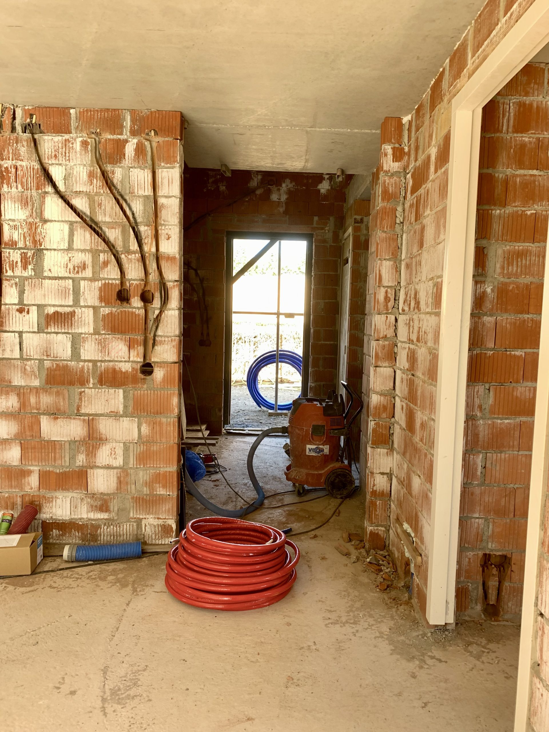 Zo begin mei (2024) ziet het huis er al uit als een echt huis. De voeger is ook een paar keer gekomen. Lea trakteert ze op een ijsje en in de avond zien we dat de verpakkingen gewoon ergens neer zijn gegooid. Ook is het voor de rest weer een flinke puinbak op de bouw. Binnen ligt er overal vanalles. Het is een dik stofnest en we moeten eigenlijk zo’n Darth Vader kap ophebben als er geveegd wordt. Ook buiten is het kermis. Hout, schroeven, zink, piepschuim, plastic bandjes, kapotte bakstenen, kapotte binnenstenen, plastic, beton, en ga zo door. We struinen zo nu en dan in de avonduren de bouw af en ruimen op wat we tegen komen. Het is nog even gesteggel tussen de voeger en dakmeneer. Want het regent, er missen hier en daar pannen en de regenpijpen zijn nog niet geïnstalleerd. Dus de stenen worden nat en met te natte stenen is voegen not done. Je krijgt dan namelijk verschillende kleuren voeg en dat wil je niet. Binnen wordt er flink doorgewerkt: de zogenaamde ‘hakker’ is een paar keer geweest en is – inderdaad – komen hakken. Inmiddels lopen de elektriciteitspijpen door het huis, zitten de buizen van de wtw-installatie in de muur en zijn de inbouwreservoirs van de wc’s geplaatst. Ook is het huis voor een groot deel afgevoegd. Met een flinke tip om de ramen en kozijnen af te dekken als de mannen komen voegen. Want het voegsel ligt overal en als het glas erin gaat is het poetsen, poetsen en nog eens poetsen.