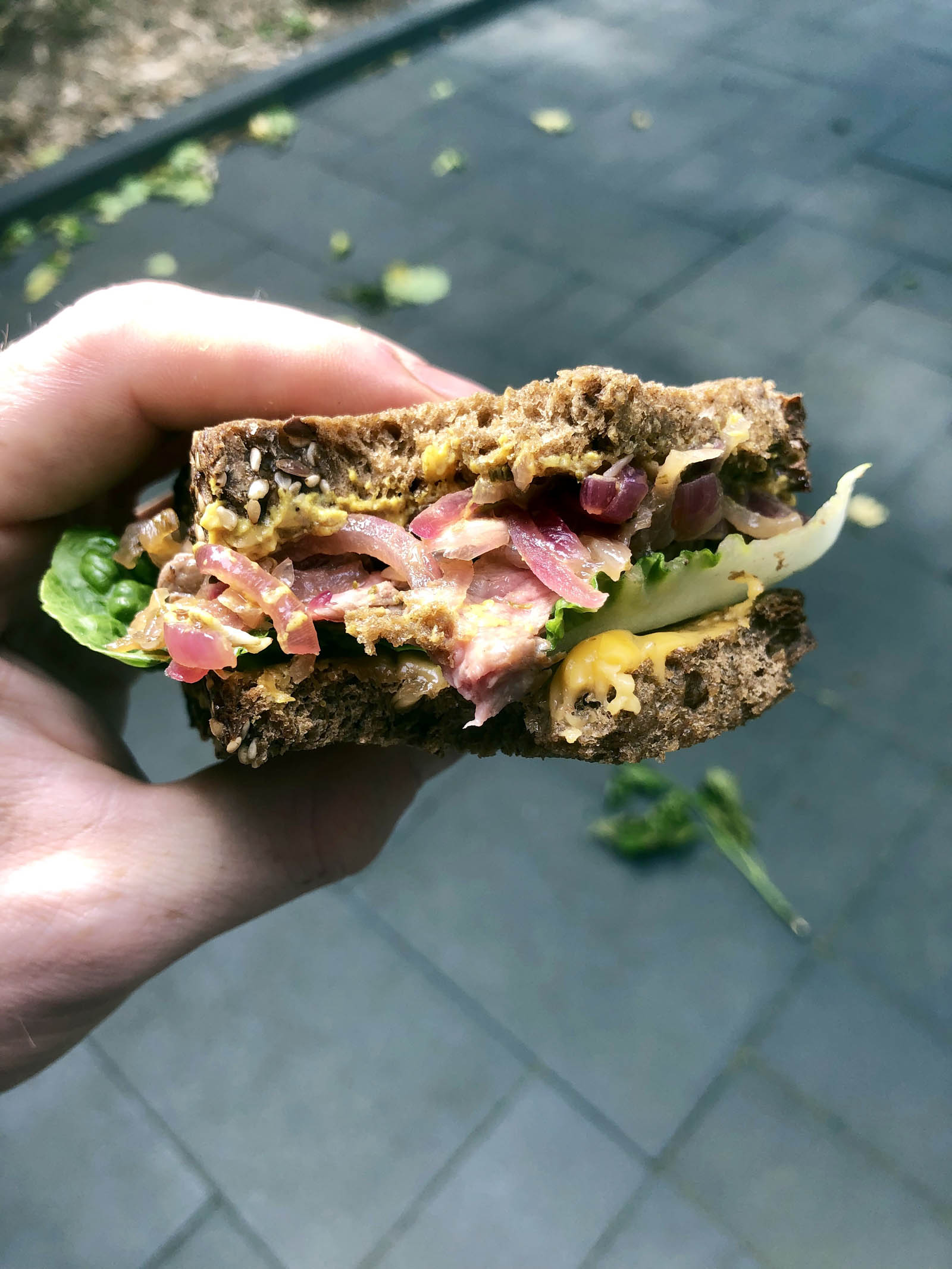 ‘Manneneten’ – al zal menig vrouw dit ook lusten. Ik had nog brood liggen en een lekkere ribeye steak. Dat moet op, zeker op deze mooie, maar iets afgekoelde zondag. Dus: maar even een dikke boterham met ‘steak’ gemaakt. Waarom niet. Erg lekker… je neemt twee goede sneden brood. Dan twee dikke uien in ringen snijden en karamelliseren in de pan met wat (verse) rozemarijn. Na een kwartier een scheutje witte wijnazijn toevoegen, dan nog een kwartiertje aanfruiten en laten afkoelen. Grill dan het brood tot het krokant is. Leg op een snee wat cheddar en grill nog een minuutje. De andere kant besmeer je met een half teentje knoflook (gewoon de knoflook eroverheen wrijven). Lekkere mosterd erop, uien erop, dan de roze gebakken steak in reepjes, knapperige sla erop en dan de snee brood met cheddar erop. De kant met cheddar moet trouwens aan de binnenkant 🙂 Nu ik dit recept trouwens hier neertik bedenk ik me dat zure komkommerreepjes ook nog lekker waren geweest op deze sandwich!